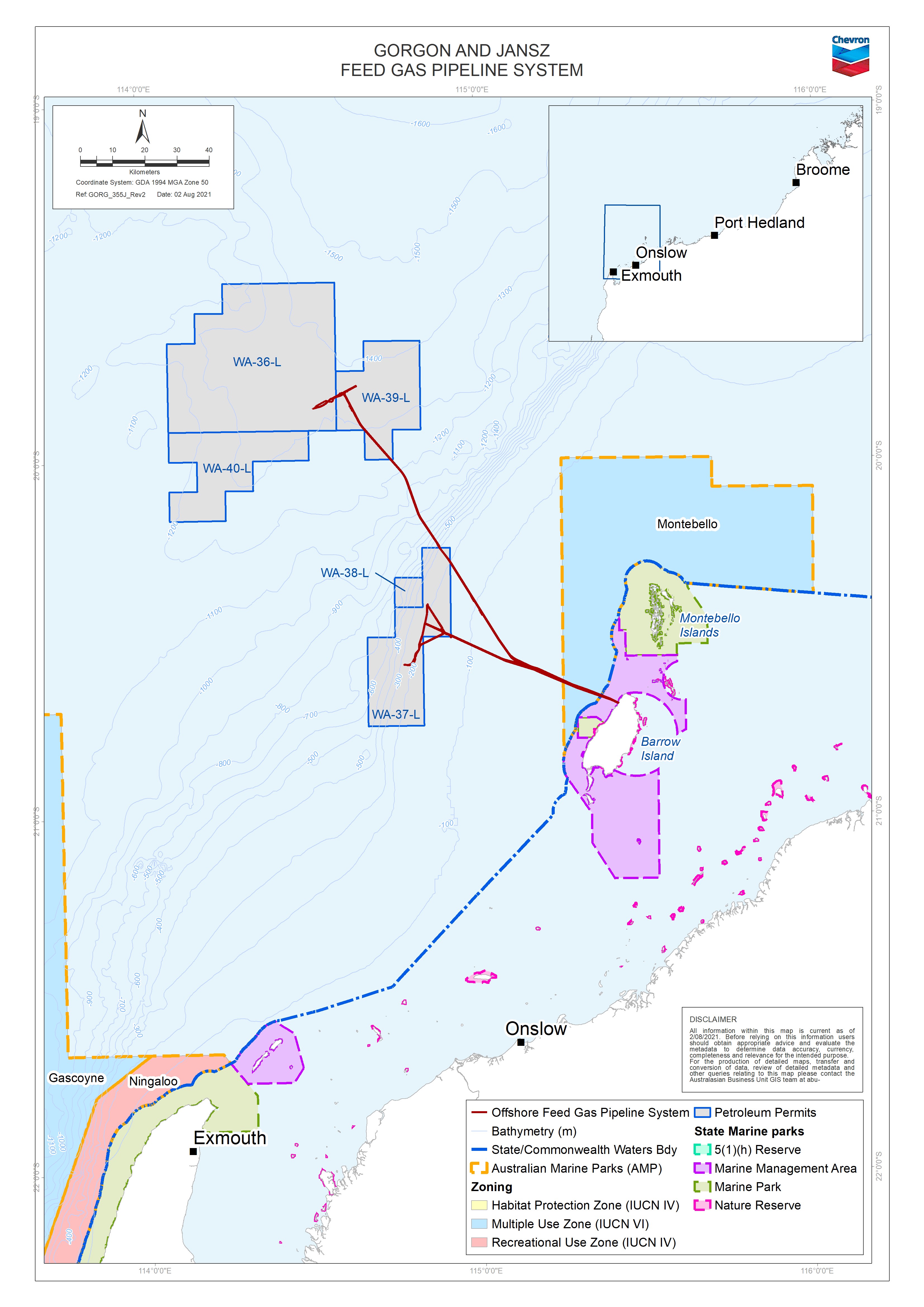 The Gorgon and Jansz Feed Gas Pipeline and Wells Operations (Commonwealth Waters) Environment Plan covers activities in Commonwealth Waters associated with the commissioning, start‐up and operation of the Gorgon and Jansz Feed Gas Pipeline and Wells (the petroleum activity). Activities occurring outside the Operational Area or in the State jurisdiction are not included in the Plan. The Jansz–Io gas fields are located within production licenses WA‐36‐L, WA‐39‐L and WA‐40‐L approximately 200 km off the north‐west coast of Western Australia in water depths of approximately 1,350 m. The Gorgon gas field is located within production Licences WA‐37‐L and WA‐38‐L, approximately 130 km off the north‐west coast of Western Australia, and 65 km north‐west of Barrow Island in water depths of approximately 200 m. The wells associated with the Plan are located in WA‐36‐L, WA‐37‐L, WA‐38‐L and WA‐39‐L. The pipelines are located in Commonwealth Waters within pipeline licences WA‐19‐PL and WA‐20‐PL. The initial field development comprised of wells and subsea infrastructure, including the Feed Gas Pipeline, associated with the Gorgon Foundation Project, which was commissioned in 2015. This field development is being supplemented by Gorgon Stage 2 (GS2), which comprises additional wells and subsea infrastructure within the Gorgon and Jansz-Io gas fields. GS2 was part of the original field development plans for the Gorgon Gas Development. Commissioning and start‐up activities associated with GS2 are expected to commence in the first half of 2022. Operations of the Gorgon Gas Development are expected to continue for the nominal operational design life of 50 years. Inspection, maintenance and repair activities may occur at any time during commissioning, start‐up and operation. The timing of activities is indicative, and subject to potential delays caused by weather events, vessel availability and other unforeseen factors. The scope of the Plan covers petroleum activities associated with the commissioning, start‐up, and operation of the Gorgon and Jansz Pipeline and Wells in Commonwealth Waters. The petroleum activities addressed in the Plan include: commissioning and start‐up operations inspections, maintenance and repair (IMR) activities, and field support activities including support vessel activities and helicopter transfer. |