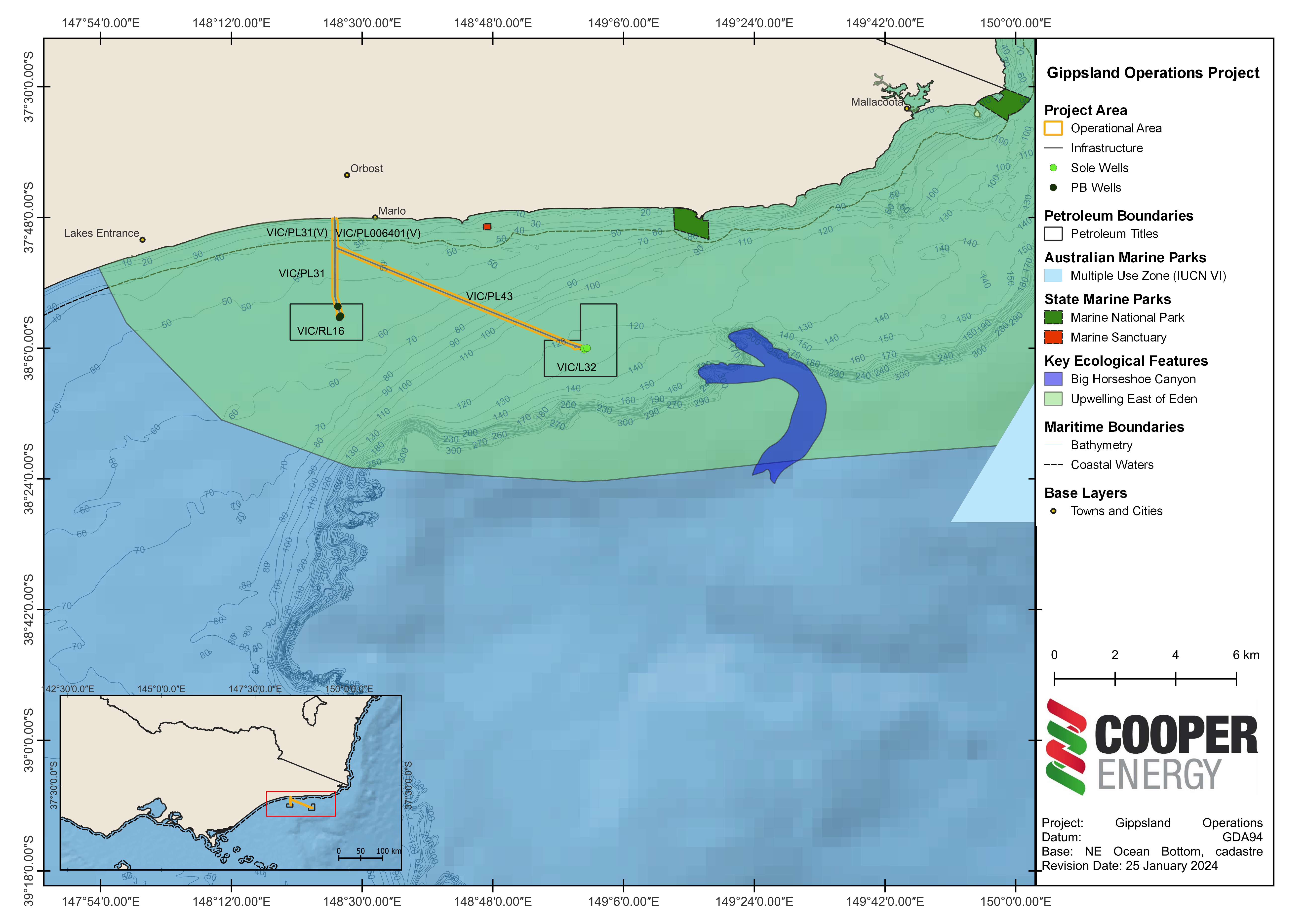 Cooper Energy Limited (Cooper Energy) holds a 100% interest and is the operator of the Gippsland Offshore Operations assets off Victoria’s south-west coast within the following Licence areas: • Patricia Baleen gas field and associated infrastructure in VIC/L21, 25 km south of Marlo, and associated pipeline and umbilical (VIC/PL31 and VIC/PL31(V)) to the Orbost Gas Plant; and • Sole gas field and associated infrastructure in VIC/L32, 40 km south of Bemm River, and associated pipeline and umbilical (VIC/PL43 and VIC/PL006401(V) to the Orbost Gas Plant. The Gippsland Offshore Operations fields and associated infrastructure are in Commonwealth waters and the Patricia Baleen and Sole pipeline and umbilical(s) are within Commonwealth and State waters. Water depths across the Gippsland Offshore Operations assets range from 9 m to 125 m. This Environment Plan (EP) is submitted as a 5-year revision of the Gippsland Offshore Operations EP. The scope of the activities related to the Gippsland Offshore Operations and covered by this EP are: Operation of the Sole gas field consisting of the following infrastructure (24/7, 365-days a year): - The Sole-3 and Sole-4 production wells; - A 65 km subsea pipeline and umbilical connecting the Sole-3 and Sole-4 wells to the Orbost Gas Plant; and - Sole-2 wellhead Non-productive phase of the Patricia Baleen fields and associated shut-in infrastructure consisting of: - The Patricia-2 and Baleen-4 wells; - A 24 km subsea pipeline and umbilical cable connecting the Patricia-2 and Baleen-4 wells to the Patricia Baleen Gas Plant; and - Patricia-1 suspended well. Inspection, maintenance and repair activities on the Patricia Baleen and Sole infrastructure from Dive support or Construction support vessels with ROV. Indicatively, vessel-based IMR activities are expected to occur every 1-2 years, and may have a duration of between 2-4 weeks, up to ~8 weeks in the unlikely case that a major repair is required. |