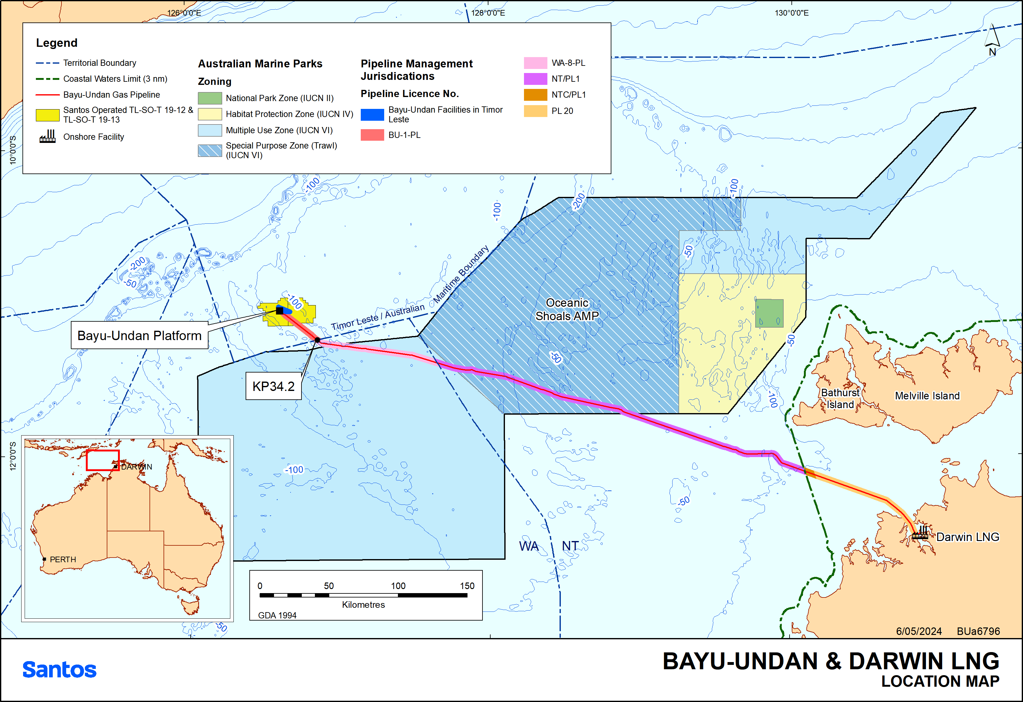 Santos NA Darwin Pipeline Pty Ltd (Santos) is the operator of the existing Bayu-Undan to Darwin Gas Export Pipeline (the Pipeline). The Pipeline transports dry natural gas from the Bayu-Undan (BU) Field located in Timor-Leste waters to the Darwin liquefied natural gas plant (DLNG). The Pipeline has been in operation since 2005. As the BU Field is approaching the end of its commercially productive life, the Pipeline will transition from operations to a preservation state. The activities that may be undertaken under this EP, include the following: • Operations phase - Transporting dry natural gas though the Pipeline from the BU Field. Line-packing the Pipeline up to maximum operating pressure (occurs during periods of maintenance and will also occur towards the end of production at the BU Platform). Back-feed of gas from the Pipeline to the BU Platform for power generation. • Preservation phase - During the preservation phase the Pipeline will remain filled with reservoir gas, which will preserve the integrity of the line. This phase begins when the gas is no longer being used for power generation at the BU Platform. The Pipeline will remain in preservation phase until it is either decommissioned or repurposed for carbon capture and sequestration (CCS). Planning for decommissioning and CCS will occur during the life of the EP and will require separate approvals. • Pipeline inspection, maintenance, monitoring and repair (IMMR) - Typically a single vessel is used to conduct IMMR activities. Inspections/monitoring surveys are infrequent and of short duration (typically 1-3 weeks depending on the type of survey). If maintenance or repair is required, a vessel may be used at a targeted location for approximately 1 day to 4 weeks. IMMR activities are preferably undertaken from May to November, outside of cyclone season, to minimise or avoid operational disruptions. However, depending on the type of maintenance or repair requirements, IMMR activities could occur at any time during the year. The Pipeline within the scope of the EP is operated under the following licences: BU-1-PL (Timor-Leste waters); WA-8-PL and NT/PL1 (Australian Commonwealth waters); and NTC/PL1 and PL20 (NT waters). It extends for approximately 502 km from the subsea isolation valve (which is approximately 480 m downstream of the BU Platform) to the beach valve at the DLNG. The ‘Operational Area’ extends 500 m from the Pipeline centreline (i.e. 500 m each side of the Pipeline), along the length of the Pipeline, within which the Petroleum Activity will take place |