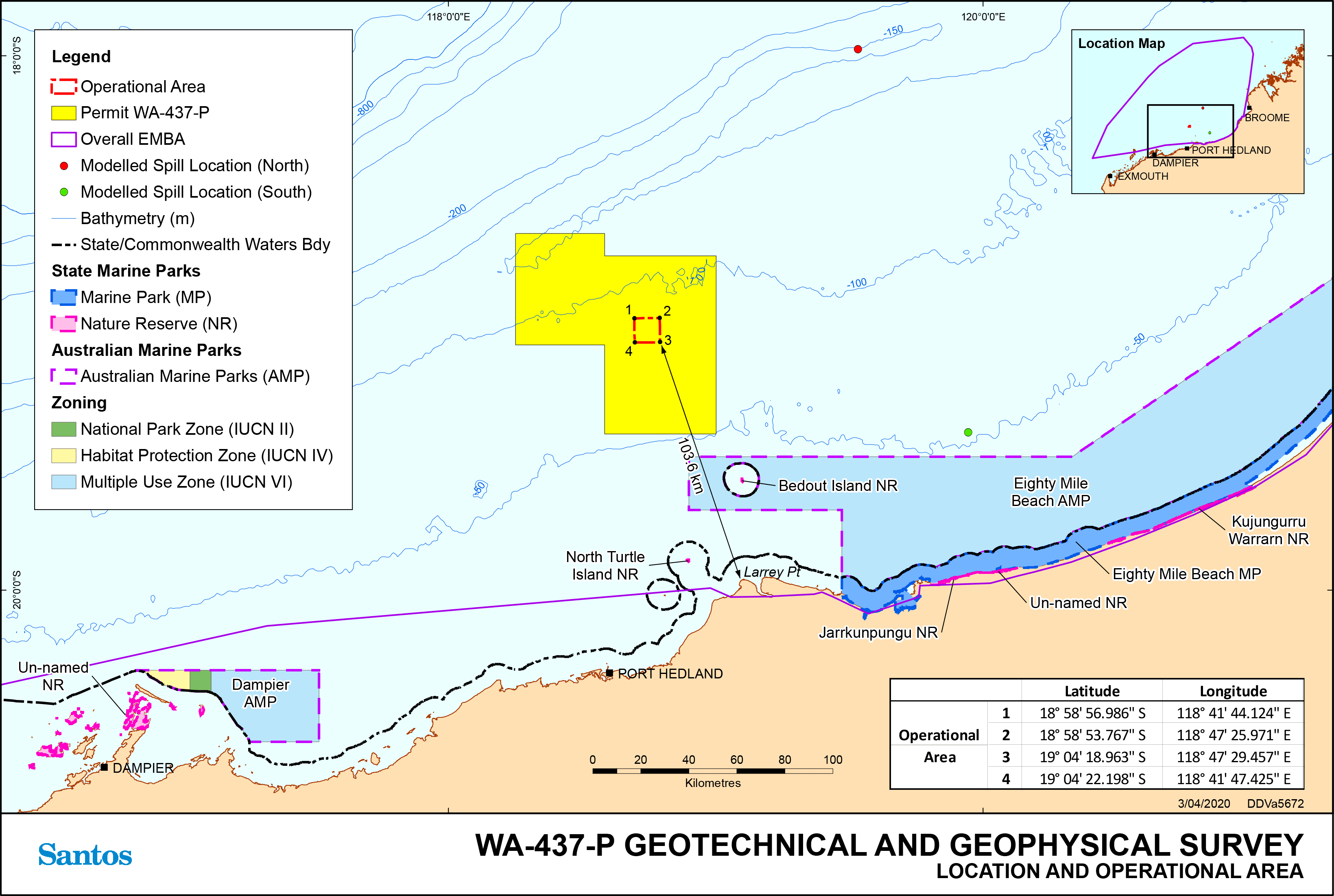 Santos WA Northwest Pty Ltd (Santos) plans to conduct a geotechnical and geophysical survey within Permit WA-437-P located in Commonwealth waters. The site survey location at it’s closest point is approximately 145km from the town of Port Hedland. The site survey is required to support pre-engineering studies for any future development and aims to aid in the understanding of the local geology and identify any potential subsea hazards. The geophysical component of the survey is required to obtain detailed bathymetry measurements and detect hazards on or below the seabed that may exist. Geophysical data collection will consist of single beam echo sounder (SBES); multi beam echo sounder (MBES); side scan sonar (SSS); and sub-bottom profiling (SBP). The geotechnical survey is required to collect detailed information on the properties of the seabed and the underlying shallow sediments to build a picture of the local geology of the area and support geophysical data collected. The geophysical survey will consist of; in-situ penetration testing; borehole sampling via piston coring, vibrocoring or rock coring (substrate pending); and box coring. An Operational Area has been defined within Permit WA-437-P, which represents a 10 km x 10 km area encapsulating all potential geotechnical and geophysical survey locations. Water depths across the Operational Area range in water depths from approximately 86–94 m (LAT). The Survey has been planned as follows: • Phase 1 to commence as early as Q2 2020 and is estimated to take 15 days to complete. • Phase 2 may follow Phase 1 or commence as part of a subsequent mobilisation during 2020/2021 and is estimated to take 45 days to complete. • Both phases will be completed by December 2021. The timing of the Survey is dependent upon vessel availability, weather conditions, the receipt of the required statutory approvals. Note the stipulated durations do not however, provide for vessel transit times, potential delays caused by ocean conditions, weather downtime, standby and equipment failure or other delays relative to the survey plan, as these factors are difficult to predict or quantify. Survey activities will be undertaken 24 hours per day. |