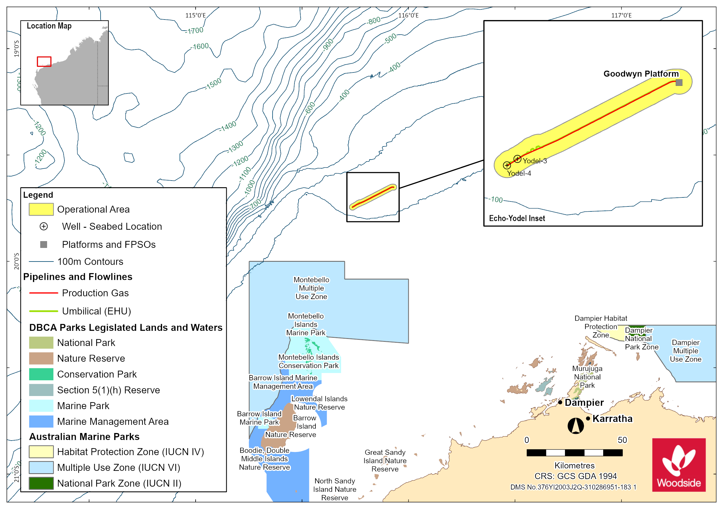 Woodside Energy Ltd. proposes to remove the Echo Yodel subsea infrastructure within Permit Area WA-9-PL. The ‘Echo Yodel subsea infrastructure’ is defined as: • a pipeline with pig launcher connected • an electrohydraulic umbilical (EHU) • two umbilical termination assemblies (UTAs) • an infield umbilical termination basket (IUTB) • infield control jumpers. The infrastructure is located in Commonwealth waters in the NWS Province, about 140 km north west of Dampier on the coast of Western Australia. The closest landfall is the Montebello Islands, which are approximately 68 km to the south of the Operational Area. The Operational Area is defined as a radius of 1500 m on either side of the pipeline and EHU. The infrastructure will be removed between 2022 and 2026 by a number of vessels during one or multiple campaigns. The cumulative duration of the activity is two to eight months and is dependent on further engineering assessment, vessel availability and unforeseen circumstances and weather. Once underway, activities will be 24 hours per day, seven days per week. The pipeline will be recovered via reverse reel lay, reverse S-lay, cut and recover, or a combination of these three methods. The EHU is planned to be recovered onto reels using a heave compensated crane and associated equipment. Deburial and marine growth removal (e.g. water jetting) may be required to enable safe recovery of the infrastructure. |