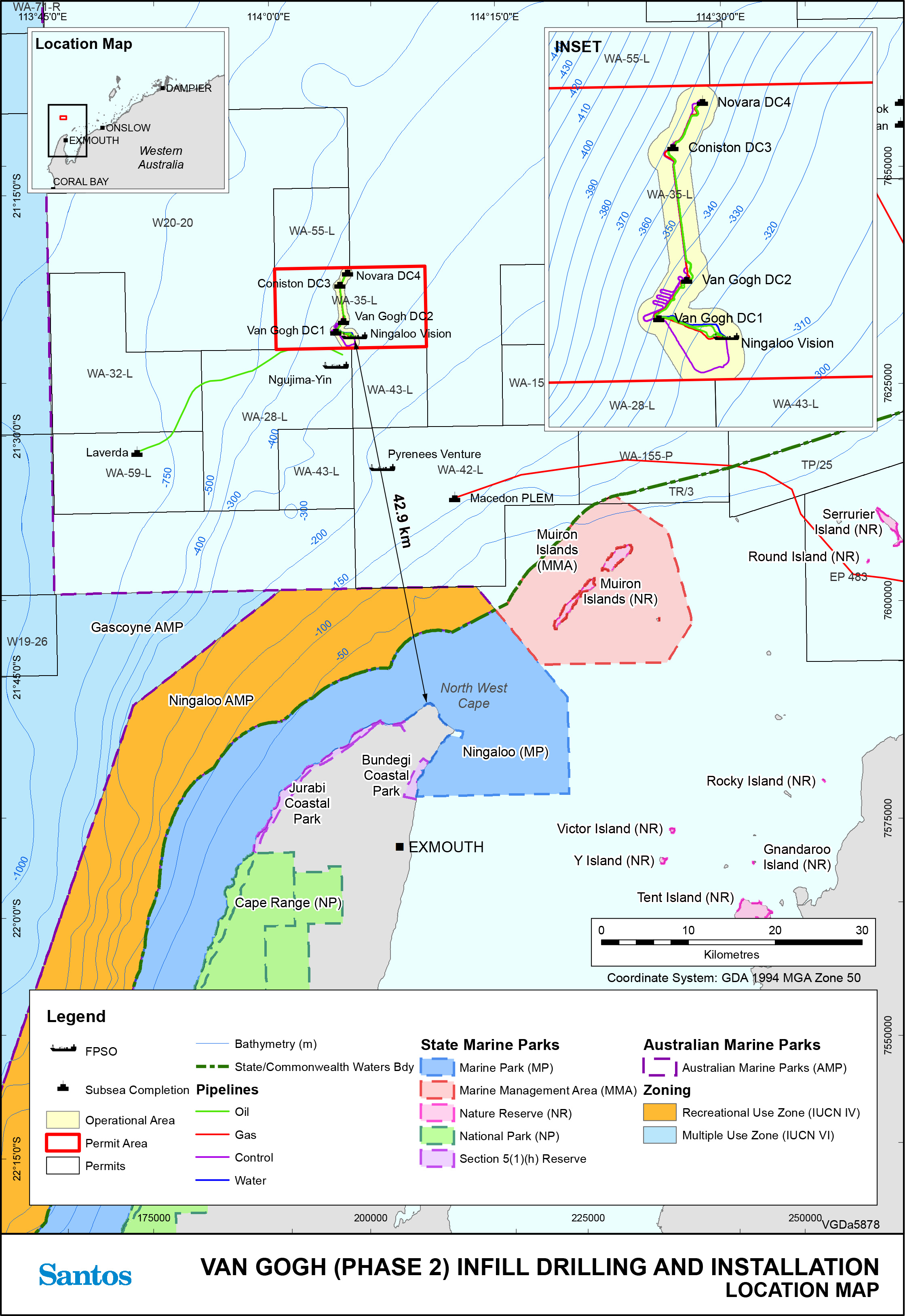 Santos operates the Van Gogh, Coniston and Novara fields via a Floating, Production, Storage and Offtake (FPSO) facility; the Ningaloo Vision (NV). The Van Gogh, Coniston and Novara Drilling and Completions Environment Plan (EP) is a five-year drilling EP to drill up to six additional wells in the licence area WA-35-L and WA-55-L. The EP was accepted by the National Offshore Petroleum Safety and Environmental Management Authority (NOPSEMA) in November 2016. In 2018, two production wells were drilled under the EP and Santos now proposes to drill three additional dual lateral wells under the same drilling EP. Installation activities to tie these three new wells back to the NV production facility is the subject of this EP. The scope of this EP covers the installation activities needed to tie in the three new dual lateral wells into the existing infrastructure at Drill Centre 1 (DC1) and Drill Centre 2 (DC2), including well installation, pre-commissioning, cold commissioning and surveys. Following completion of the activities under this EP, production operations are covered under the NOPSEMA accepted Ningaloo Vision Operations EP. The VGID2 installation will take place entirely within production licence WA-35-L. Activities associated within the scope of this EP will be conducted within a defined ‘Operational Area’, which is a 500 m radius around DC1 and DC2 respectively and shown in the location map. DC1 and DC2 are situated around 2 km apart in an approximate water depth of 380 m. They are located approximately 45 km from the North West Cape and 110 km from the town of Onslow Western Australia. VGID2 installation activities will be undertaken in two campaigns: + Campaign 1 (DC1), estimated 9 days + Campaign 2 (DC2), estimated 13 days Allowing for weather and operational delays, the total time required to install the wells could be up to 50 days. The earliest date for commencement of the activity is Q2 2021 with all activity completed on, or before 31st December 2022. |