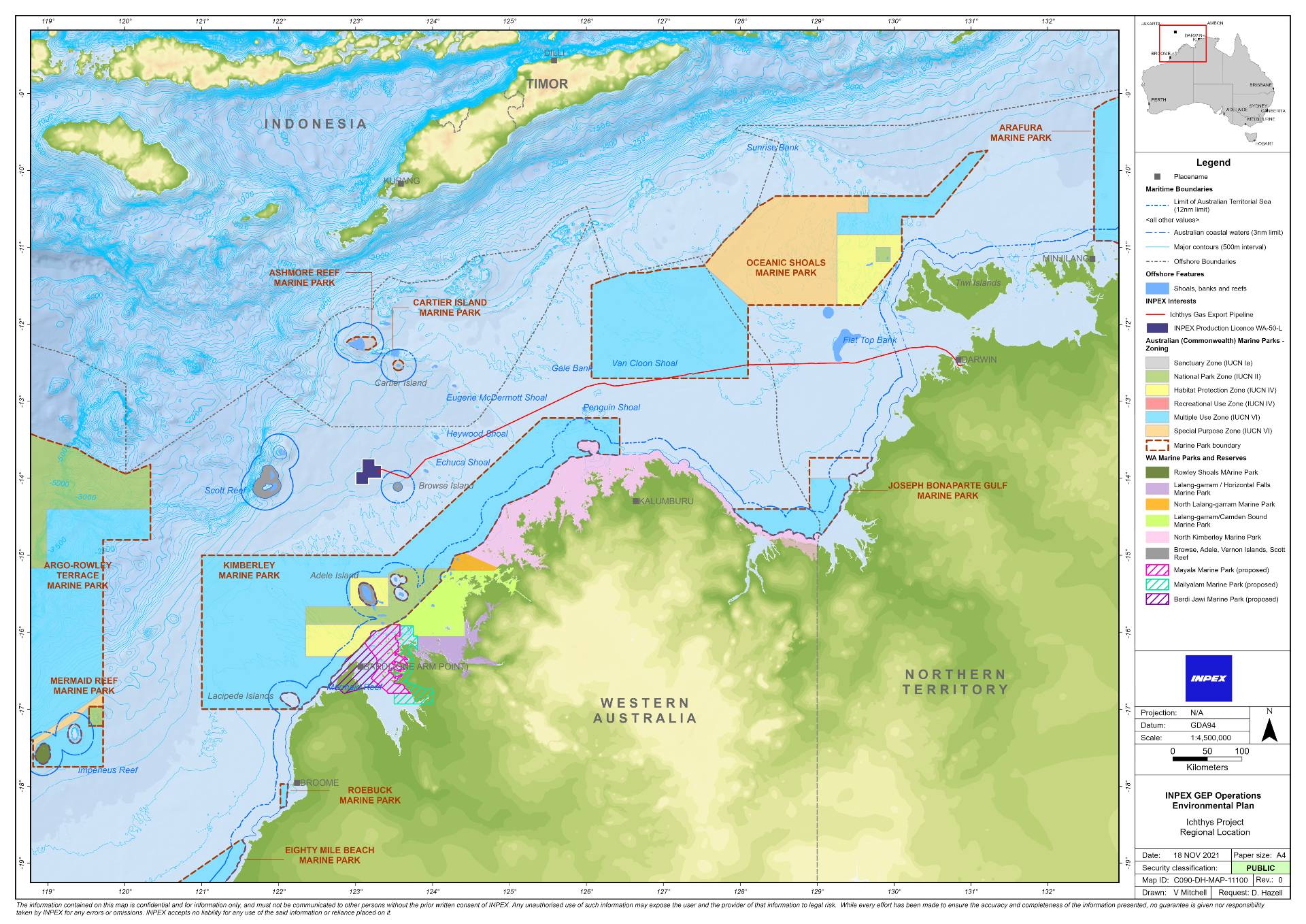 In 2011, Commonwealth approval (EPBC 2008/4208) was obtained to develop the Ichthys Field in the Browse Basin. This included, but was not limited to, the installation and operation of the offshore infrastructure for the 40-year field life. The Ichthys Field is in petroleum production licence WA-50-L in the Browse Basin about 220 kilometres off the north west coast of Western Australia and 820 kilometres south west of Darwin. Water depths range from 235 to 275 m in WA-50-L and along the gas export pipeline (GEP) range from 250 m at the gas export riser base (GERB) in WA-50-L, to 30 m at the boundary of Commonwealth waters and the NT three nautical mile (nm) limit. Hydrocarbon production involves gas from the Ichthys Field undergoing preliminary processing at the offshore central processing facility (CPF) to remove water and raw liquids, including the greater part of the condensate. This condensate is pumped to the interlinked floating production, storage, and offtake facility (FPSO) with hydrocarbon processing and monoethylene glycol (MEG) regeneration capabilities. The gas and some condensate are transported from the CPF along an 890 kilometre long subsea GEP for further processing at Bladin Point in Darwin. Liquefied petroleum gases (LPG) and liquefied natural gas (LNG) and condensate are produced onshore from the export gas on behalf of the Ichthys Downstream Incorporated Joint Venture. This EP is the first 5-year EP revision for the operation of the GEP and covers the next 5 years of the expected 40-year Ichthys field life. Operations are ongoing on a continuous 24/7 basis. During the life of this EP, inspection, maintenance repair activities may be required to ensure the safe and efficient operation of the GEP and associated infrastructure. Inspection of the GEP will be conducted in accordance with a risk-based inspection schedule. Inspections of the pipeline will generally involve a vessel travelling along the route of the pipeline using towed acoustic instruments, a remotely operated vehicle connected to the vessel via an umbilical, or an autonomous underwater vehicle which is launched and recovered from the vessel. In addition, marine acoustic surveys (e.g. side scan sonar and multibeam echo sounders) may also be undertaken. These inspections are typically conducted from a vessel or autonomous underwater vehicle fitted with acoustic instruments. Typically vessels will be on site for approximately 5 to 60 days per year depending on the type of inspection. Events such as cyclones, known dropped/ dragged objects or seismic activity that could affect the GEP may also trigger inspections. Maintenance and repair activities (such as a minor repair involving installation of a clamp) will be conducted based on the results of inspection and monitoring of the GEP. Should a major repair (spool replacement) be required, the activity of de-pressuring the GEP, including pigging/dewatering/isolation and discharges of GEP contents into the marine environment is within the scope of this EP. If maintenance or repairs are required, a vessel may remain on site for approximately 15 to 60 days at a time, depending on the nature of the work required. |
