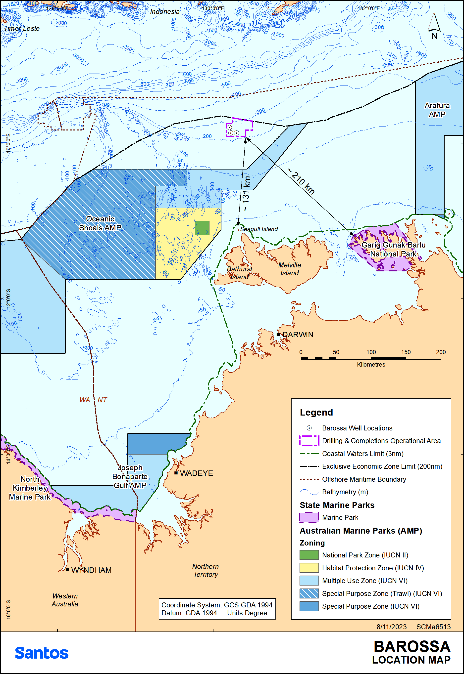 The Barossa Development is an approved offshore natural gas and condensate development proposed to backfill gas supply to the existing Darwin LNG (DLNG) facility at Wickham Point. Natural gas would be extracted from the Barossa field, located in Commonwealth waters approximately 285 kilometres offshore north-north west from Darwin, and transported via gas pipeline (Gas Export Pipeline (GEP) and Darwin Pipeline Duplication (DPD)) to the existing DLNG facility. Santos NA Barossa Pty Ltd (Santos), is the Operator of the Barossa Development, on behalf of co-venturers SK E&S Australia Pty Ltd, JERA Barossa Pty Ltd and Santos Offshore Pty Ltd, with first gas production targeted for the first half of 2025. The Barossa Development is described in the Barossa Development Area Offshore Project Proposal (OPP), which was accepted by the National Offshore Petroleum Safety and Environmental Management Authority (NOPSEMA) in March 2018. As part of the approved development, Santos is planning to commence the development drilling and well completions campaign within Commonwealth petroleum production licence NT/L1 in 2023. Drilling and well completions activities may be undertaken at any time of year within the five year activity window. The planned duration for drilling and completion of each well is estimated to take approximately 90 days of continuous well operations (24 hours per day, seven days per week) and the total duration for the planned drilling campaign is estimated to be approximately 2 years. The ‘Operational Area’ encompasses the entire petroleum production licence. Water depths over the operational area range from approximately 204 m to 376 m. The operational area is approximately 33 km from the Oceanic Shoals Australian Marine Park. Six subsea production wells are planned to be drilled and completed around the future locations of three subsea production manifolds, with two wellheads adjacent to each manifold. If required, up to two contingency production wells could be drilled and completed at any manifold (eight wells in total). This EP provides for drilling and completing the wells using a semi-submersible Mobile Offshore Drilling Unit (MODU) and light well intervention vessel, and the ongoing management of the complete wells until future commissioning and production phases. Activities included in the Barossa Development Drilling and Completions Environment Plan are: • Movement of the MODU within the Operational Area (including entry to and exit from of the Operational Area). • MODU and vessel commissioning and demobilising activities. • Deployment and recovery of the MODU anchors and mooring lines. • Deployment and operation, and eventual removal, of a temporary acoustic survey positioning system. • Drilling operations, including temporary well suspension and subsequent re-entry as required. • Well completions, including perforating and well flowback. • Installation of Christmas trees. • Contingency activities such as side-track drilling, re-drilling sections, re-spud and abandonment. • Well intervention. • Ongoing well inspection, maintenance and management. • General operations associated with the use of a MODU, vessels, helicopters and remotely operated vehicles (ROVs) within the Operational Area. A petroleum safety zone will extend in a 500-m radius around the MODU surface location (at each drill centre) and completed subsea well location. During drilling activities, a cautionary zone will be place around the MODU and anchors which may extend up to 2.5 km from the MODU. The Barossa Development Drilling and Completions Environment Plan will remain valid for 5-years from the date that it is accepted by NOPSEMA, (subject to any requirement for earlier revision under the Offshore Petroleum and Greenhouse Gas Storage (Environment) Regulations 2009). |