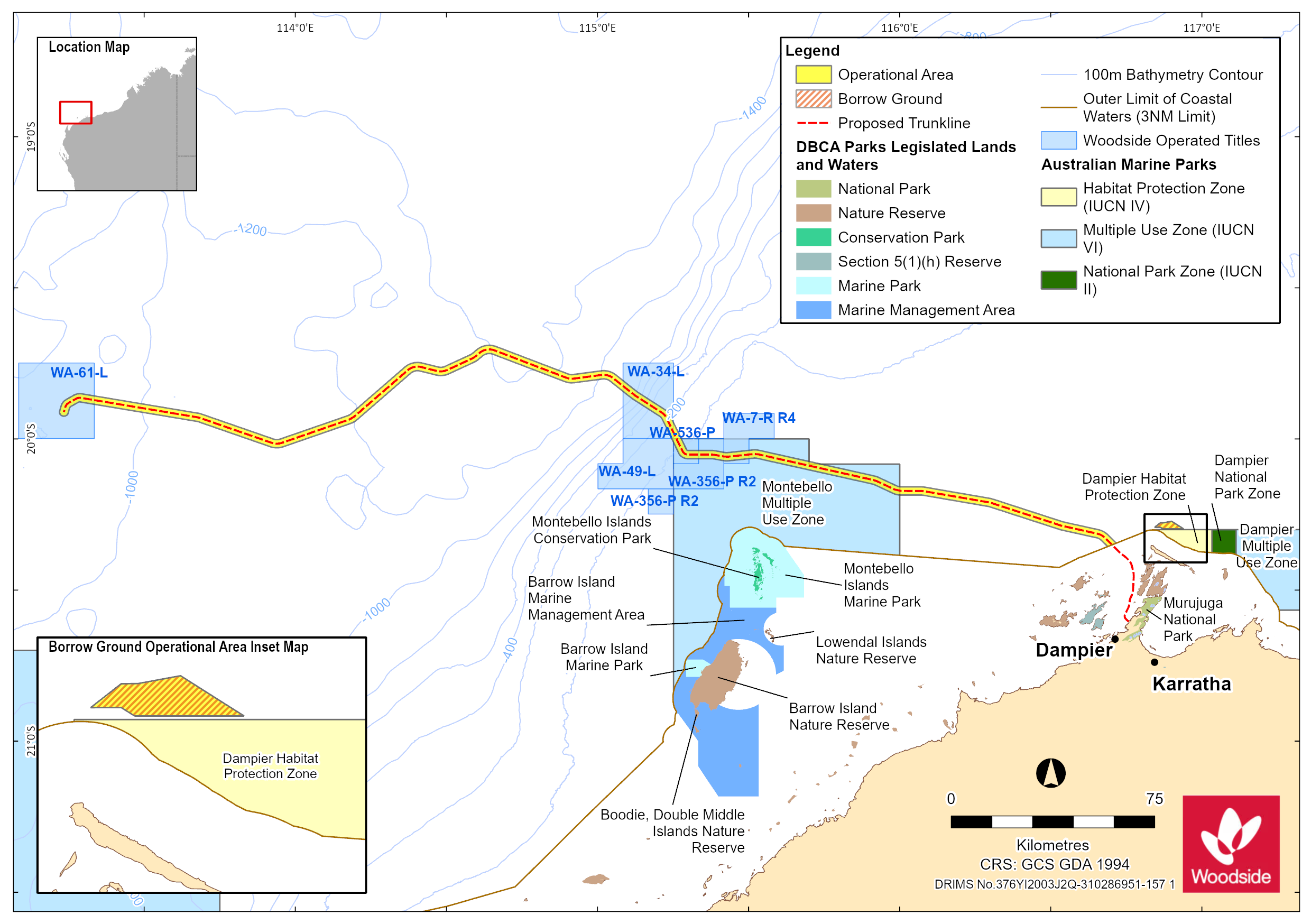 The Environment Plan covers Seabed intervention and Trunkline installation activities in Commonwealth waters for the Scarborough development. Activities run from the Commonwealth – State waters boundary approximately 32 km north of Dampier to the Scarborough gas field located at Woodside-operated title block WA-61-L, approximately 375 km west-northwest of the Burrup Peninsula. The approx. water depth for the activities is 32 m – 1400 m The earliest activity commencement date is Q4 2023 pending approvals, vessel availability and weather constraints. The estimated activity duration is 24 months across multiple campaigns. The Eastern end of the Trunkline route overlaps with the Pilbara Port Authority Dampier Port Limits. The trunkline corridor runs through the Montebello Marine Park – Multiple Use Zone (Cth), close to the northern boundary. The Operational Area includes the proposed Trunkline from the Scarborough FPU (approximately 430 km north-west of the Burrup) to the State waters boundary and 1.5 km either side of the proposed Trunkline centreline to allow for the movement and positioning of vessels. This also includes Spoil Ground 5A, which is approximately 300 m wide and runs ~17 km from the State waters boundary. It also includes the Offshore Borrow Ground (location where sand will be sourced) which is located to the north of the Dampier Marine Park Habitat Protection Zone and 20 km to the east of the proposed Trunkline route. A minimum 250 m buffer will be in place from the Dampier Marine Park boundary. Vessels included in the activity: • Trailing suction hopper dredge (TSHD) • Offshore construction vessel (OCV) • Rock Installation Vessel (RIV) • Pipelay Vessel (PV) multi-joint operation • Shallow Water Lay Barge (SWLB) • Anchor handling vessel/tug • Pipe supply vessels • Survey vessels • Support vessels • Fuel bunkering vessels |