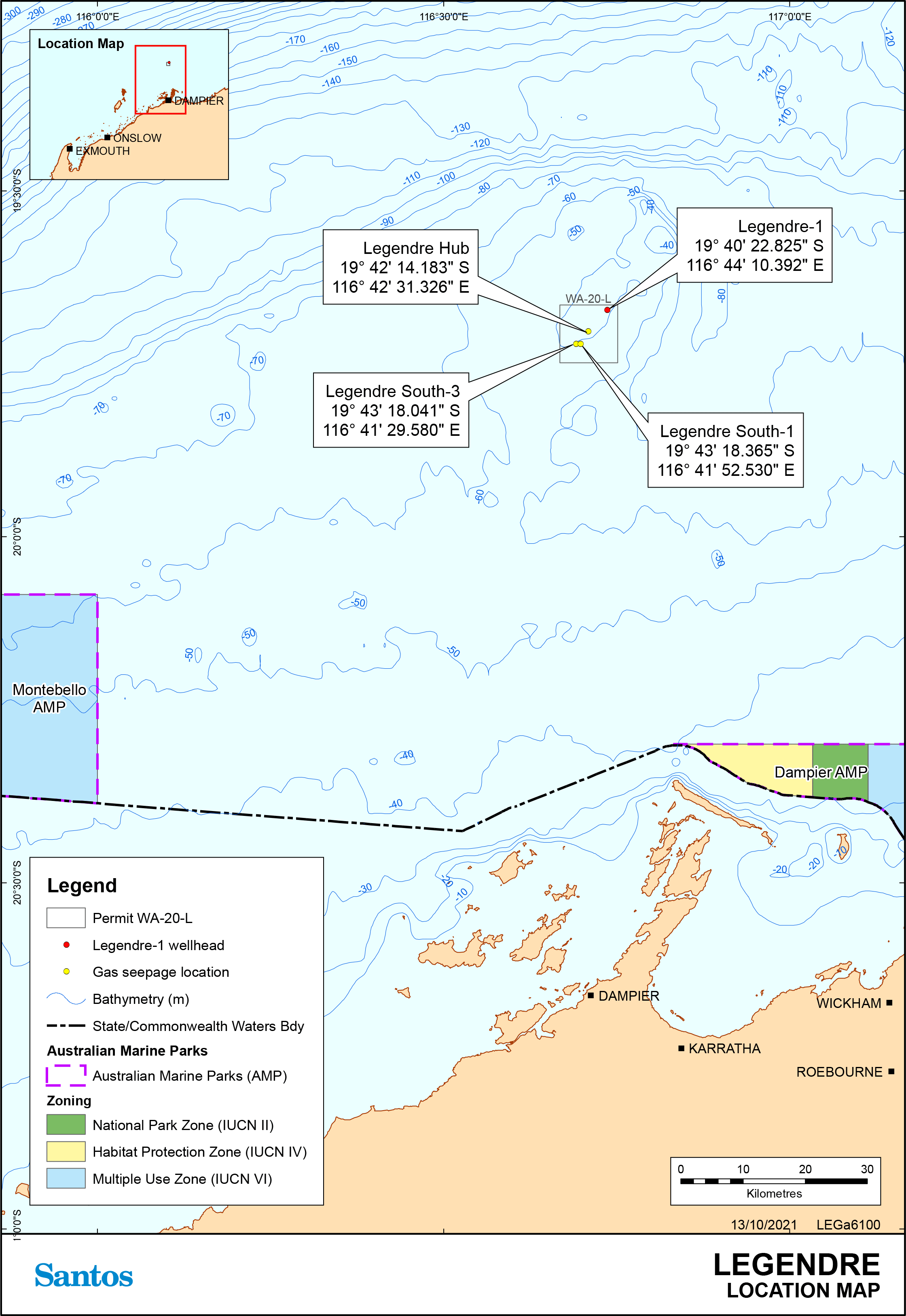 Santos WA Northwest Pty Ltd (Santos) and Santos Limited hold the title for WA-20-L in Commonwealth waters of the North West Shelf. The activity occurs in Production License WA-20-L, approximately 105 km north of Dampier, Western Australia. The petroleum activities covered under the EP are: - The ongoing gas seepage in the form of small bubbles emanating from the seabed into the water column at the Legendre Hub, Legendre South-1 and Legendre South-3 locations. - The presence of the Legendre-1 wellhead, which has been in situ since the well was permanently plugged and abandoned in 1968. - Vessel-based surveillance, monitoring, inspection and research activities may be required in support of these two petroleum activities so for completeness have been described within this EP. |