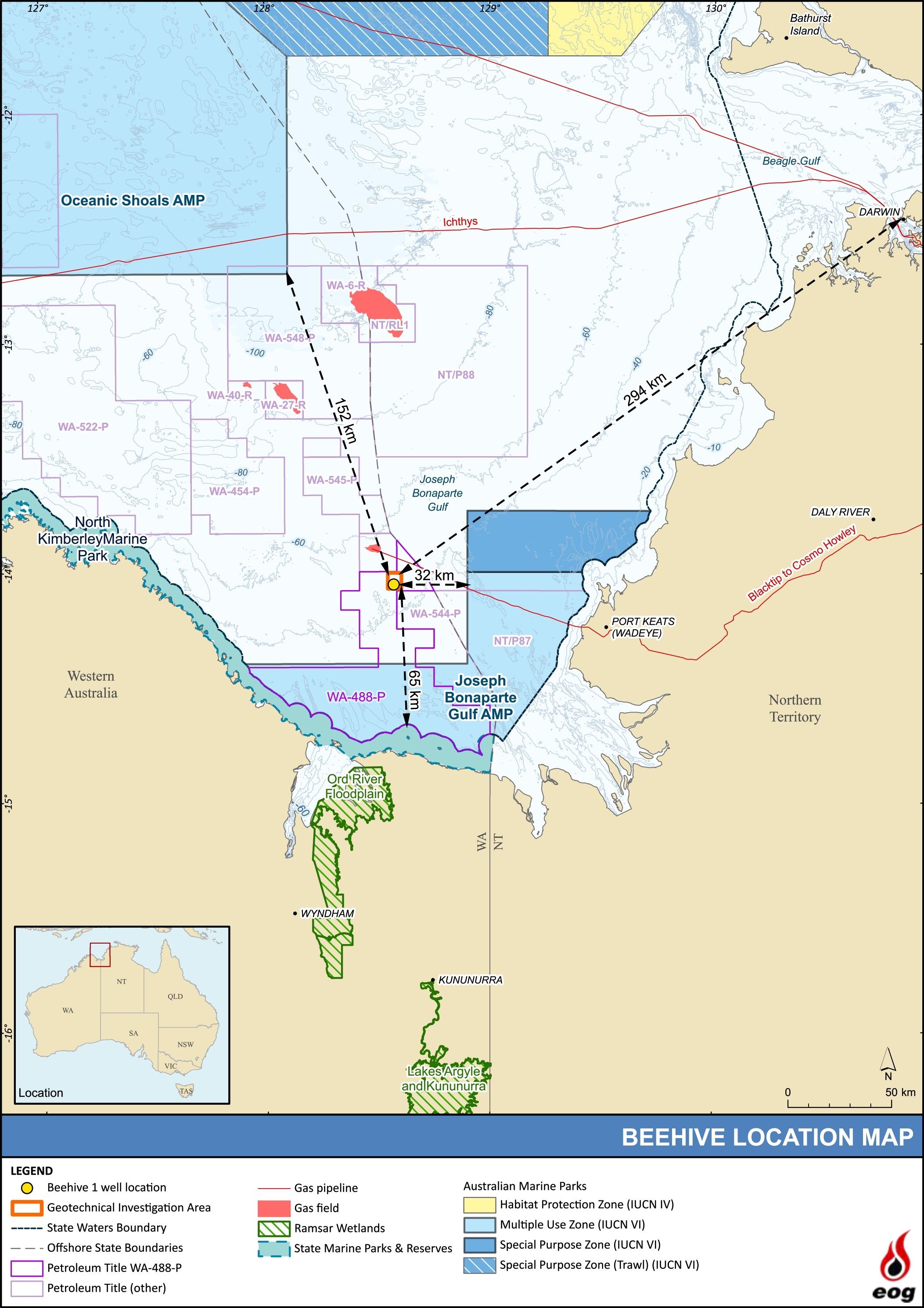 EOG Resources Australia Block WA-488 Pty Ltd (EOG) is the titleholder of permit WA-488-P, located in Commonwealth waters of the Joseph Bonaparte Gulf (JBG) off the northern Western Australian (WA) coastline. EOG proposes to undertake geotechnical investigations within an activity area located approximately 77 km offshore from the nearest WA coastline and 87 km from the Northern Territory (NT) coastline. The activity is referred to as the Beehive Pre-Drill Geotechnical Assessment. The activity area covers an area of approximately 50.8 km2 and occurs in water depths ranging from 35 metres (m) to 50 m. The purpose of the activity is to assess and characterise the seabed and sub-seabed conditions to support a jack-up Mobile Offshore Drilling Unit (MODU) that will be used to drill the Beehive-1 exploration well, as well as provide data for potential future wellsite placement. The geotechnical investigations acquire physical measurements and samples of the local shallow geology at and around the potential MODU location(s), using the following techniques: • Borehole sampling to acquire high quality soils for laboratory testing to inform the detailed engineering design in the field; and • Piezo cone penetrometer testing to determine seabed strength and general ground stratigraphy. Samples and data will be collected at up to 15 investigation sites within the activity area. The activity is scheduled to be completed between January 2024 and December 2025, with the exact timing within this time window dependent on the receipt of environmental approvals, vessel/equipment availability and fair sea state conditions suitable for the activity. The activity is estimated to take up to 2 weeks in total to complete, although this is dependent on the exact methods and technologies used as well as weather conditions at the time. |