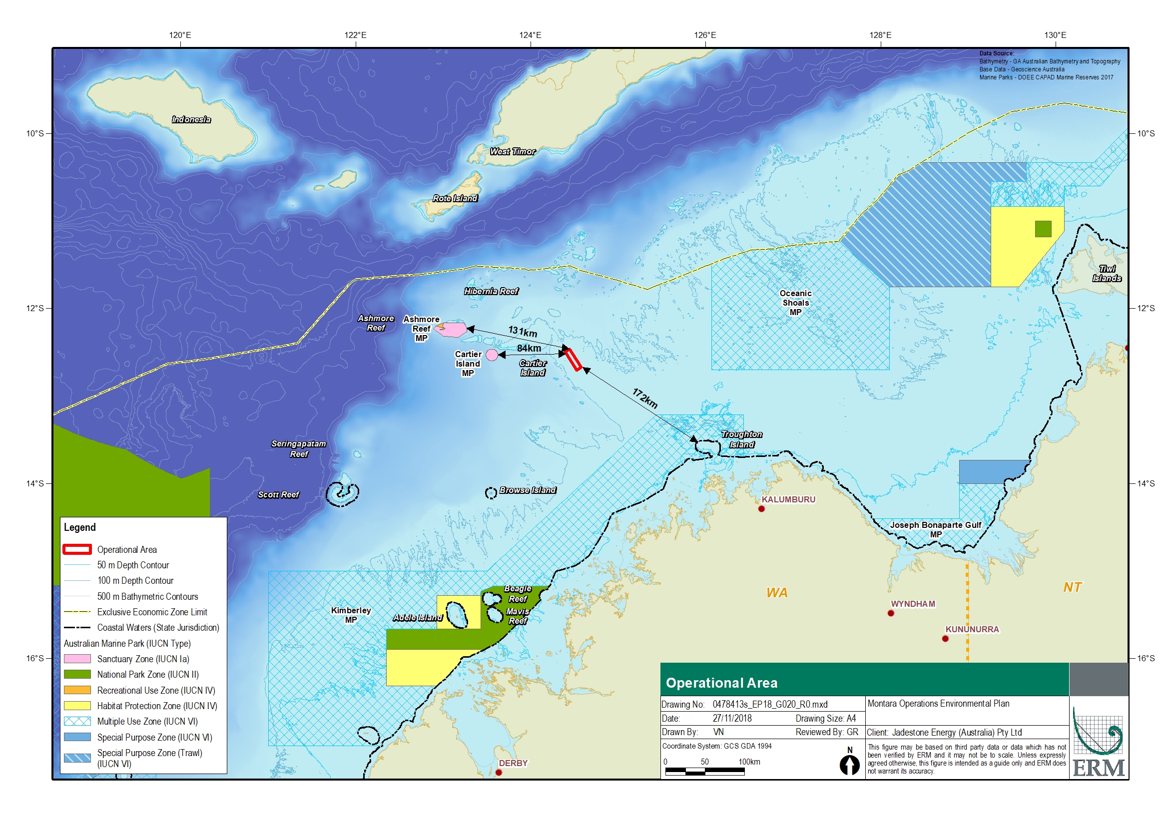 The Montara Venture Floating Production Storage Offtake (FPSO), unmanned wellhead platform and subsea infrastructure, are located in the Timor Sea, in the Ashmore Cartier territory within Commonwealth waters, approximately 690 km north-west of Darwin within 34 km of Vulcan Shoal. The facilities lie in water depths of approximately 80 m. Production at the Montara field commenced in Quarter 2 2013 and the activity is expected be fully operational until approximately 2030. Currently, crude oil is produced from the Montara, Skua, Swift and Swallow fields which is transported via flowline for processing at the well head platform and FPSO. The well head platform currently has five production wells, and there are five subsea production wells located approximately 17 to 18 km from the FPSO. The Montara infrastructure is marked on nautical maps surrounded by a 500 m petroleum safety exclusion zone within which vessels are prohibited from entering. This EP was submitted as a revision under regulation 39(2) for when a new or increased environmental impact or risk is identified. In addition, the EP has been updated to allow for the continuation of production at the Montara Facility for a further 5 years. This EP provides for operation of the FPSO and well head platform, and associated subsea infrastructure, situated in licenses AC/L7 and AC/L8. In addition, the EP provides for inspection, maintenance and repair of infrastructure, support services, and unplanned activities including oil spill response. |