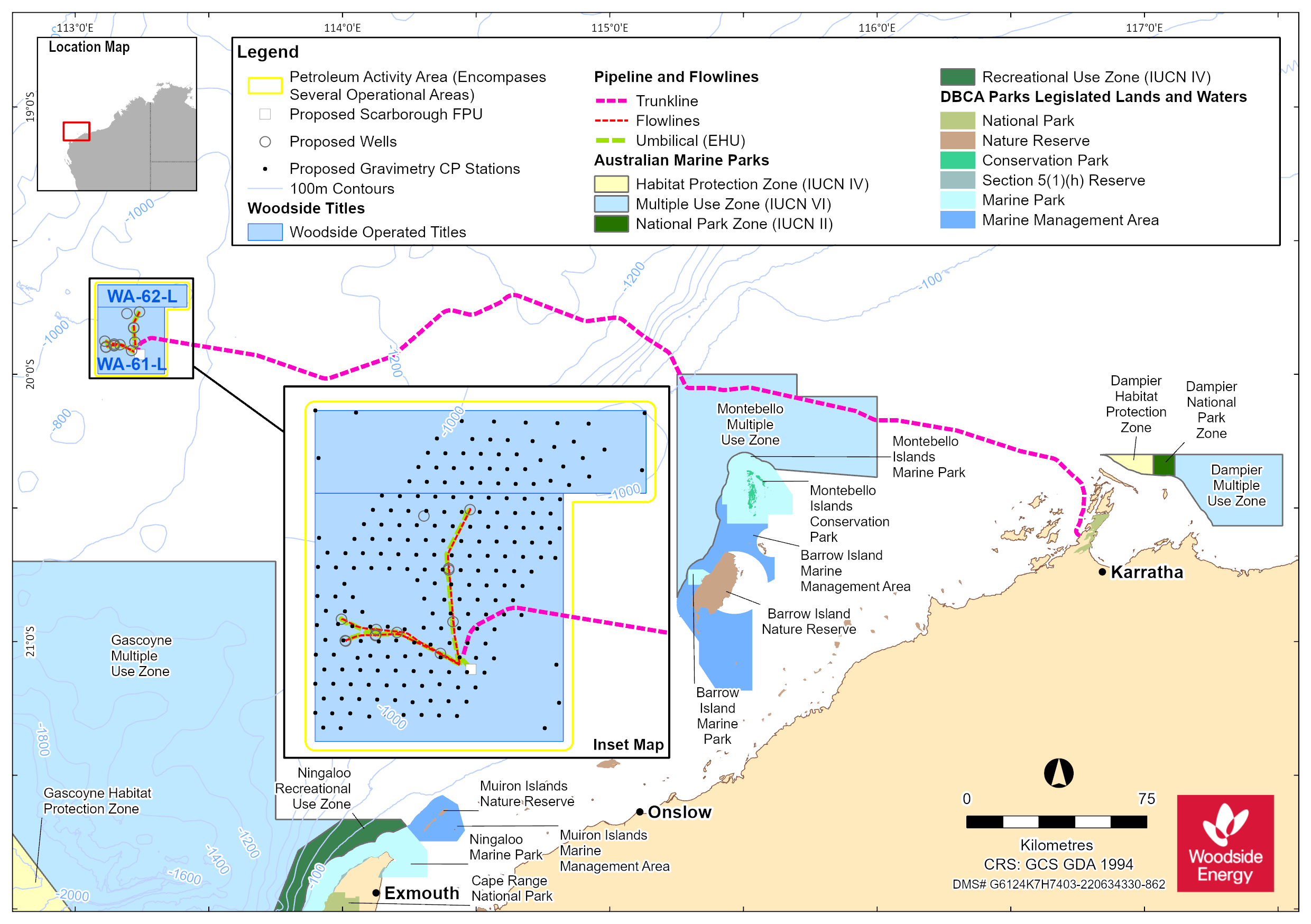 Woodside proposes to install subsea infrastructure, carry out survey activities and infrastructure testing. The Petroleum Activities Program includes installation of subsea infrastructure, gravimetry preparation and baseline survey and floating production unit (FPU) mooring pre-lay.. The Petroleum Activities Program is located within Permit Areas WA-61-L and WA-62-L in Commonwealth waters, about 374 km west-northwest of Dampier, Western Australia. The closest landfall to the Petroleum Activities Program is the North-West Cape, about 226 km south-south-east at its nearest point. The Petroleum Activities Program has an estimated cumulative duration of 18 months (excluding IMMR activities), with activities occurring in multiple campaigns for completion within a three-year window. The earliest commencement date is estimated to be the second half of 2023. |