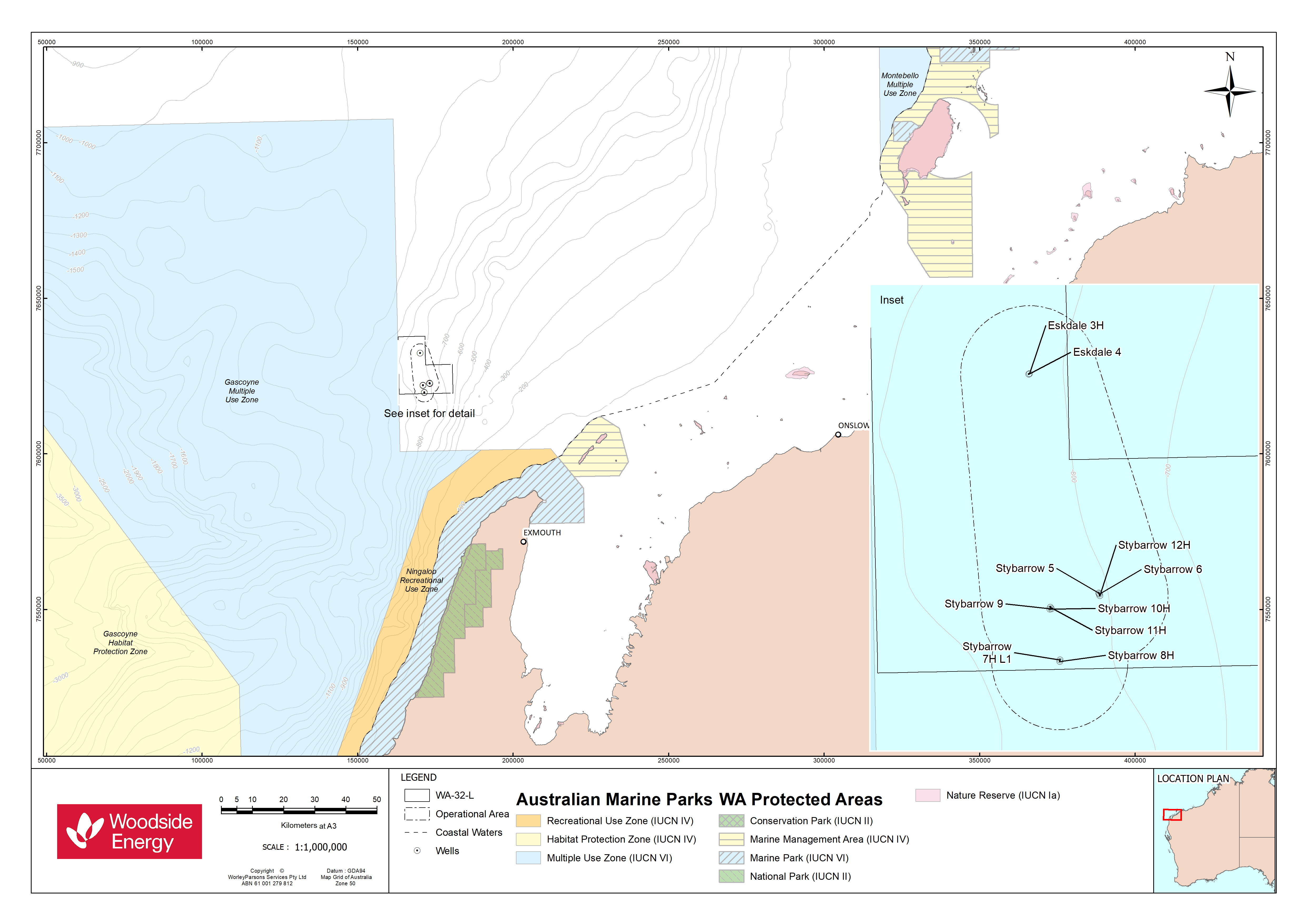 Woodside Energy (Australia) Pty Ltd (Woodside), as Titleholder under the Offshore Petroleum and Greenhouse Gas Storage (Environment) Regulations 2009 (Commonwealth), proposes to undertake permanent plug and abandonment (P&A) activities of the Stybarrow development wells within offshore Permit Area WA-32-L. The petroleum activities include the P&A of ten subsea wells including production, gas injection and water injection wells and removal of all well infrastructure above the mudline. The P&A activity will be conducted within Commonwealth waters approximately 55 km north-west (NW) of Exmouth, Western Australia, in water depths between 790 m – 850 m. The nearest point of the Stybarrow Operational Area to the mainland (North West Cape) is approximately 41 km. The Operational Area is defined by a 3,000 m radius around each of the drill centres for the Stybarrow production wells. This radius allows for the installation of a temporary mooring system for a moored semi-submersible MODU and cannot reasonably be reduced. The Operational Area includes a temporary 500 m radius exclusion zone around the MODU during the Petroleum Activity to manage vessel movements. P&A activities are dependent on the availability of a suitable MODU. The earliest the preparatory and P&A activities may commence is Q4 2023. The permanent plugging of the Stybarrow wells within WA-32-L is required to be completed no later than the 30 September 2024, pursuant to Direction 1 of General Direction 833. It is intended the well infrastructure above the mudline will either be recovered using the MODU directly following the plugging of the wells, or alternatively may be temporarily wet stored and recovered using a project vessel as part the Stybarrow subsea infrastructure removal campaign. Removal of well infrastructure above the mudline may commence in Q1 2024 and is required to be recovered no later than 31 March 2025, under Direction 2 of General Direction 833. Following the completion of all prior activities, final recovery of all remaining ancillary equipment will be completed. |