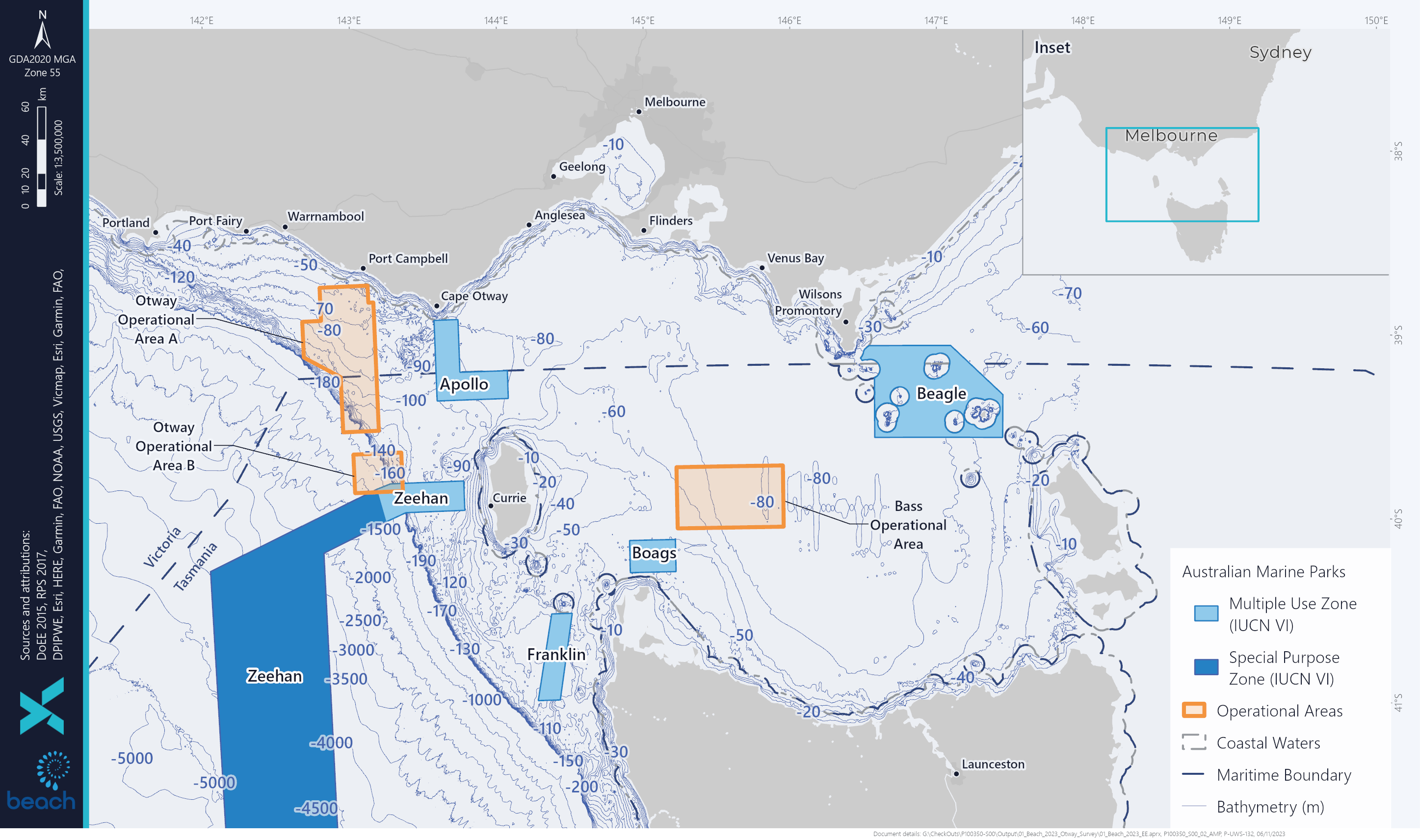 Beach Energy (Operations) Limited (Beach), who are wholly owned by Beach Energy Limited , on behalf of their Joint Venture partners, proposes to undertake geophysical and geotechnical seabed surveys within the Otway and Bass Basins in Commonwealth waters. The seabed surveys are required to inform future plug and abandonment activities of existing legacy suspended wells, drilling of subsea gas wells and potential tie-ins to connect new gas wells to existing subsea infrastructure. These future activities are outside the scope of this EP. The proposed seabed surveys will be carried out no earlier than the 1st February 2024 and no later than the 31st December 2028. The seabed surveys are estimated to take up to 200 days for the Otway Operational Area A, 40 days for Otway Operational Area B and 120 days for Bass Operational Area. The seabed surveys may be done in one campaign or as a number of campaigns. Geophysical survey methods proposed are: • Multi beam echo sounder (MBES) • Side scan sonar (SSS) • Sub bottom profiler (SBP) • Magnetometer Geotechnical sampling proposed are: • Cone penetrometer testing (CPT) • Drop coring or vibrocore In addition, seabed imagery, and sediment and water samples will be undertaken at representative locations to collect baseline data. Seismic surveys are not included in the activity scope. |