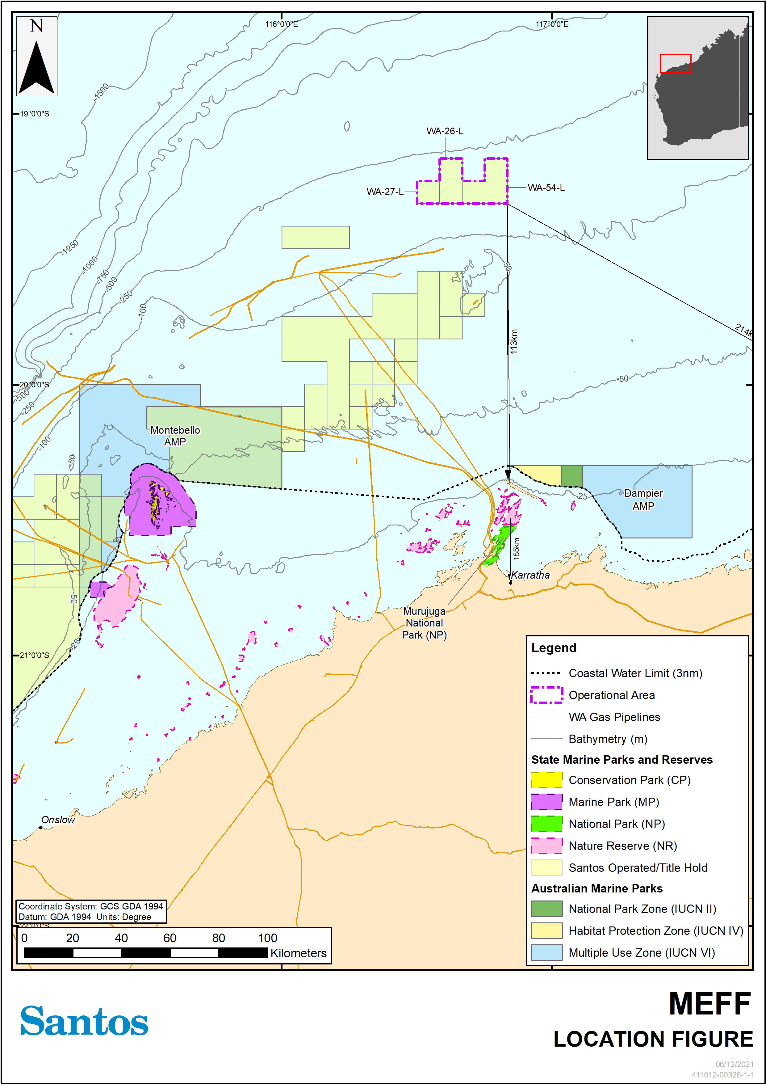 Part 8 Activity Description Overview Santos Ltd (Santos) is proposing to decommission the Mutineer, Exeter, Fletcher, Finucane field. The revision of the Mutineer Exeter Cessation of Production (CoP) Environment Plan, is to enable the continued operation of the Mutineer, Exeter, Fletcher and Finucane (MEFF) facilities in cessation phase and execute the removal of infrastructure from above the seabed. This revision now includes final seabed decommissioning activities on title, within WA-54-L, WA-26-L and WA-27-L to address sections s572 and s270 of the Offshore Petroleum and Greenhouse Gas Storage Act 2006 (OPGGS Act). The permit areas are within Commonwealth waters, approximately 160 km north of Dampier, in water depths ranging from 130 – 160m. Cessation phase commenced when production ceased in 2018, flushing activities were completed and the FPSO departed the field. Removal of the Direct Turret Mooring (DTM) and Mid Water Arches (MWA’s), was completed in Q1 2023. Removal of the remaining subsea equipment is planned to be executed in 2025/2026 with completion planned by the end of 2026. The reservoirs remain isolated from the subsea production system at the Xmas trees (XTs). All well valves will remain isolated unless they are required to be operated to allow decommissioning activities. Wells are being plugged and abandoned under a separate EP accepted by NOSPEMA in February 2024. The petroleum activities covered in this EP includes the following activities and will address inspection, monitoring, maintenance and repair (IMMR) activities on subsea equipment in the title area until removed, or decommissioned under this EP: • removal of subsea equipment normally located on the seabed during production; • abandonment in situ of six deeply buried steel anchors and the corresponding buried steel mooring chains of approximately 580 m / ~100t per mooring leg. Individual IMMR campaigns may take approximately 14 days. Decommissioning of the seabed assets may take up to 12 months cumulative duration. However, unfavourable weather and operational delays this could extend the estimated project durations. All activities could be undertaken at any time of the year, continuous over a 24-hour period and are expected to be conducted over multiple and concurrent campaigns during these time frames. The activities may be supported by one, or a combination of the following ‘vessels’: • tugs including Anchor Handling Tugs (AHT); • barges; • crew transfer vessel; • Heavy Lift Vessel (HLV); and • Dive Support Vessel (DSV) and rescue vessel Helicopters and support vessel may be used to transfer crew and equipment to and from vessels and assist in emergency as required. |