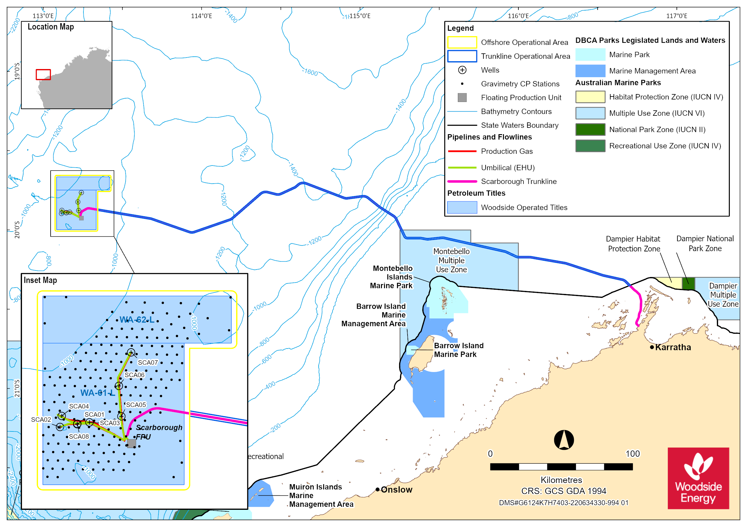 Woodside is submitting the Scarborough Offshore Facility and Trunkline (Operations) Environment Plan in accordance with the Offshore Petroleum and Greenhouse Gas Storage (Environment) Regulations 2023 (Cth). The Scarborough Floating Production Unit (FPU) associated subsea infrastructure including the Commonwealth waters portion of the export trunkline, which runs between the Scarborough FPU and onshore gas plant which is approximately 375 km west-north-west of Dampier in Western Australia. The following activities are proposed to occur within Production Licences WA-61-L and WA-62-L and Pipeline Licence WA-32-PL: • Hook-up of the Scarborough Floating Production Unit (FPU) to pre-installed moorings and subsea gathering system. • Startup and commissioning activities of the FPU and associated subsea wells, flowlines and infrastructure • Routine production and associated activities for up to 13 subsea wells (up to eight wells in phase 1 and five wells in phase 2) • Export of dry gas to the onshore gas plant, through the gas export trunkline (ETL) • Inspection, monitoring, maintenance and repair (IMMR) activities for the FPU, subsea infrastructure, and ETL • Gravimetry surveys. Installation, hook-up, commissioning and start-up is approximately twelve months, following which the operation of the FPU and export trunkline will be continuous (24 hours per day, 365 days per year) with a planned field life from startup of operations of approximately 30 years. The earliest commencement date for hook-up and offshore commissioning activities is estimated to be in the second half of 2025 pending approvals, vessel availability and weather constraints. During Hookup and Commissioning an Accommodation Support Vessel (ASV) may be utilised alongside the FPU to accommodate a higher number of personnel required during these activities. The FPU and infrastructure will be marked on nautical maps. |
