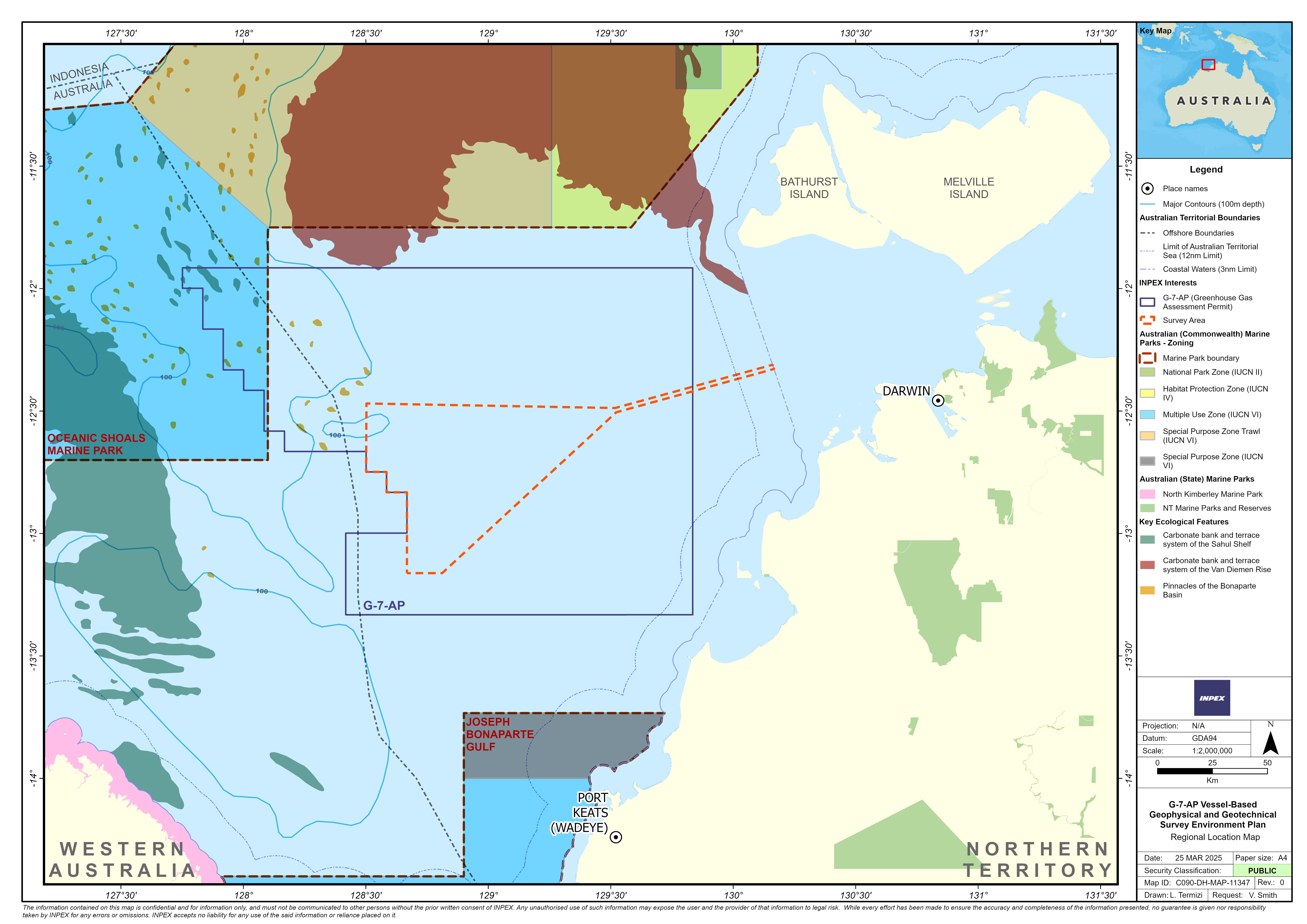INPEX, as operator of the Bonaparte Carbon Capture and Storage (CCS) Assessment Joint Venture is currently undertaking a 3-year subsurface appraisal programme of the greenhouse gas (GHG) assessment permit G-7-AP (herein referred to as G-7-AP). The purpose of the appraisal program is data collection to further understand the characteristics and suitability of the area as a future carbon storage area. To date the appraisal program has included the acquisition and interpretation of seismic survey data and the drilling of two wells for the purpose of data collection. In parallel with the appraisal programme, INPEX is conducting a preliminary assessment and selection of a suitable development concept including preliminary facility designs for the transport and sequestration of carbon dioxide. To inform the design and location of the potential future development, INPEX is proposing to undertake a range of geophysical and geotechnical surveys. The survey data obtained will be used to inform the design and location of potential infrastructure within G-7-AP and a pipeline corridor, both of which would be subject to other environmental approvals. The scope of this Environment Plan (EP) covers geophysical and geotechnical survey activities within the proposed survey area) located within G-7-AP, petroleum permit NT/P88 (exploration permit) and adjacent Commonwealth marine waters. Activities include: Geophysical survey scope comprising of: • multi-beam echo-sounder and LiDAR for bathymetry • side scan sonar • sub-bottom profiling and imaging • magnetometer Geotechnical survey scope comprising of: • seabed grab sampling (box core) • geotechnical piezocone penetration tests • geotechnical borehole, and vibrocore, and gravity cores. Collection of marine baseline data. Survey activities may be completed over several multi-week campaigns and could consist of approximately 90 to 120 days of survey activities in total potentially over three calendar years. |