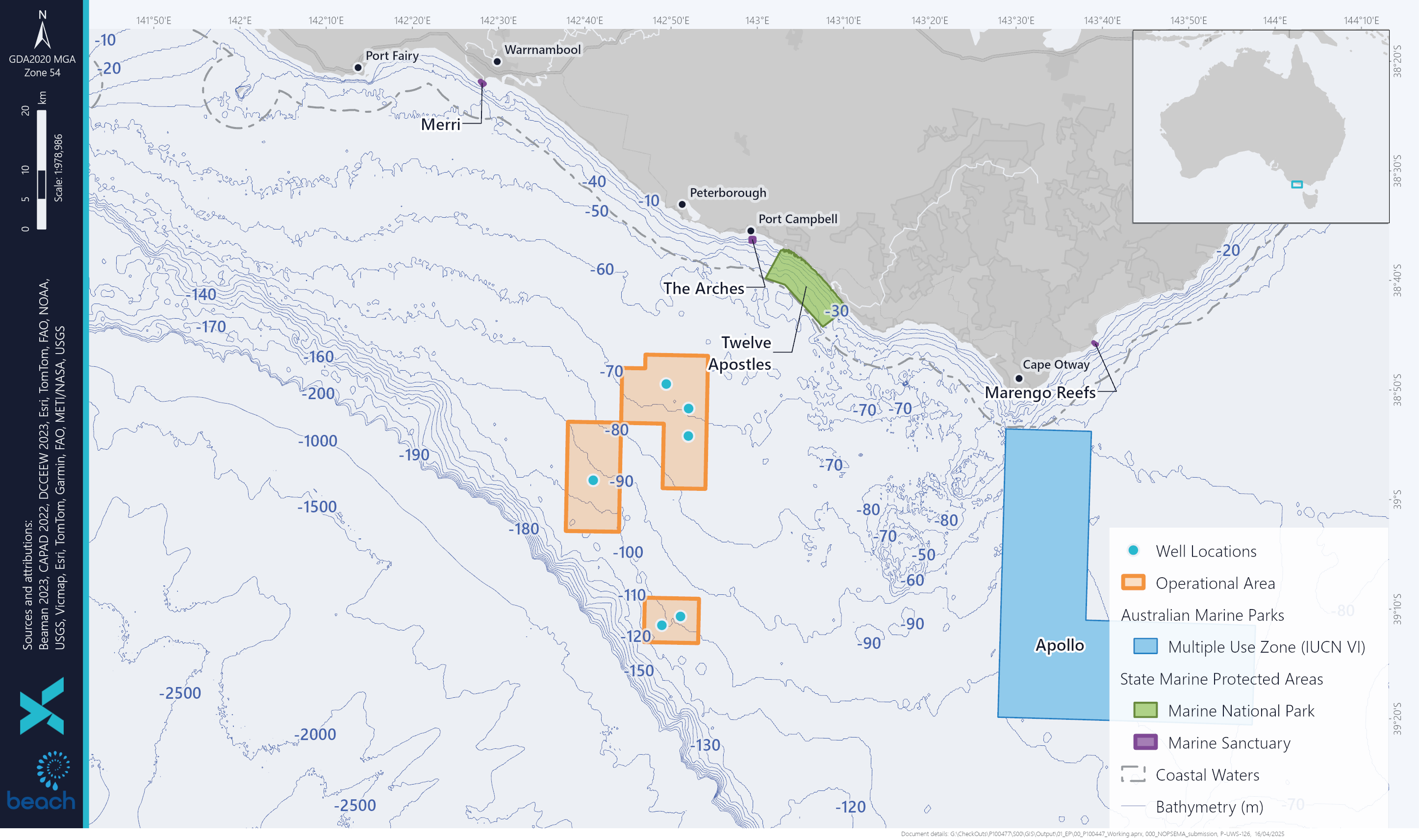 Beach Energy (Operations) Limited (Beach), proposes to undertake well completions, well interventions and contingent plug and abandonment (P&A) activities within Commonwealth waters of the Otway Basin (the Program). The proposed scope of the Program covered by the EP consists of: • Subsea production tree (XT) installation, completion installation, Mobile Offshore Drilling Unit (MODU)-based well flowback/clean-up, with a MODU in wells in VIC/L35 (2 locations), VIC/L36 (1 location), VIC/P43 (1 location), a total of up to 4 locations • Interventions at up to 2 existing well locations in T/L2 • P&A and removal of wellhead below the mudline for 1 location in VIC/L35 (contingency if decision made not to complete Artisan 1) Well completion including well flowback/clean-up (flaring), well intervention and contingency P&A activities will be undertaken within a 3 km radius around the well sites whilst the MODU is moored on location. The 3 km radius encompasses both the outer extent of mooring equipment on the seabed, and the 500 m petroleum safety zone (PSZ). The Operational Area is where planned activities will occur. The Operational Area for the Program activities include a 3 km radius around the well sites whilst the MODU is moored on location. The 3 km radius encompasses both the outer extent of mooring equipment on the seabed and the 500 m petroleum safety zone (PSZ). Estimated timing for each activity, depending on the final work program and potential operational delays, are: • Installation of XTs and well completions at up to 4 locations: 100 days total comprising of 25 days per well. This includes MODU-based well flowback/clean-up activities of 24 hours per well. • Well interventions at 2 existing well locations: 30 days total comprising of 15 days per well • Contingency P&A at one location (Artisan 1) – 15 - 20 days. Activities will be conducted on a 24 hours per day, 7 days per week basis. The above timings equate to approximately 150 days of activity for the full Program and will be undertaken within the period of 01 October 2025 to 31 December 2026. Proposed activities will be undertaken with a single moored semi-submersible drill rig with a thruster assisted mooring system (MODU). The MODU will be supported with up to three vessels. |