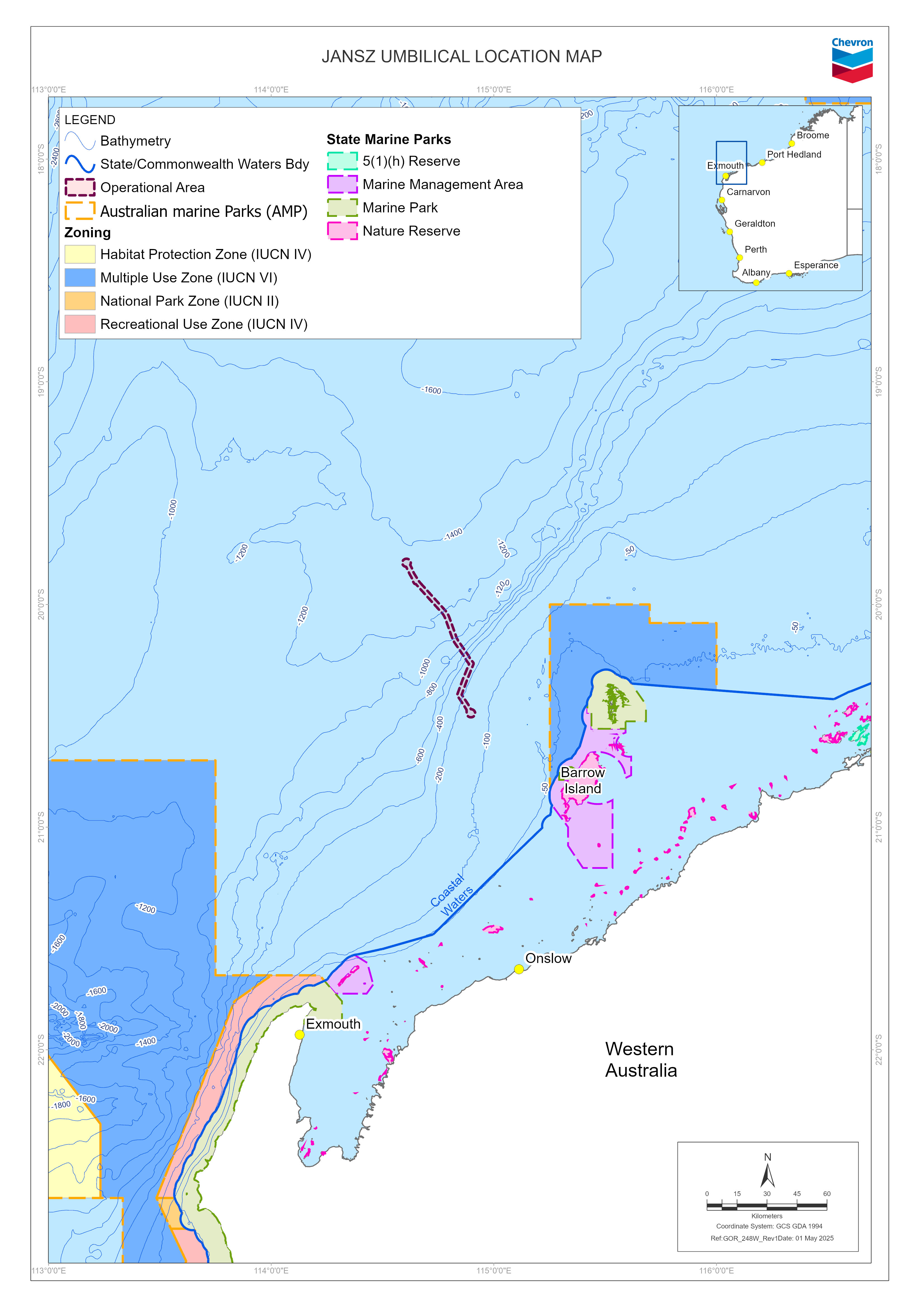 On behalf of the Gorgon Joint Venturers, Chevron Australia Pty Ltd (CAPL) is developing and operating the Gorgon Gas Development. To date, the Gorgon Gas Development hydrocarbon system includes infrastructure and activities associated with the initial field development, Gorgon Stage 2 (GS2) and Jansz–Io Compression (J–IC), collectively referred to as the Gorgon Foundation Project (GFP). Existing infrastructure includes offshore production wells within the Gorgon and Jansz–Io gas fields, and the feed gas pipeline system. The feed gas pipeline system gathers and transports gas to the Gorgon Gas Treatment Plant on Barrow Island. To support the reliability of the offshore gas gathering systems, CAPL plans to install a fibre-optic and electrical control umbilical (referred to as the umbilical) between the offshore Jansz Central Distribution Unit (CDU) and Gorgon CDU. The umbilical will provide electrical power and fibre optic communications to the Jansz gas field. Components of the existing GFP Jansz umbilical (e.g. chemical, hydraulic, and control lines) will remain in use. The use of umbilicals to support the operation of the wells and manifolds is within scope of the Gorgon Gas Development (as described in the Draft Environmental Impact Statement / Environmental Review and Management Programme for the Proposed Gorgon Development [Ref. 29]) and therefore subsequent approvals under the Environmental Protection Act 1986 (WA) and Environment Protection and Biodiversity Conservation Act 1999 (Cth) (EPBC Act). To maintain safety and reliability, maintenance and repairs of the approved elements of the hydrocarbon system are also inherently within scope of the Gorgon Gas Development. This EP documents the assessment and management of potential environmental impacts and risks associated with the petroleum activity. This EP has been prepared in accordance with the requirements of the Offshore Petroleum and Greenhouse Gas Storage Act 2006 (Cth) (OPGGS Act) and the OPGGS(E)R, as administered and for regulatory acceptance by the National Offshore Petroleum Safety and Environment Management Authority (NOPSEMA). |