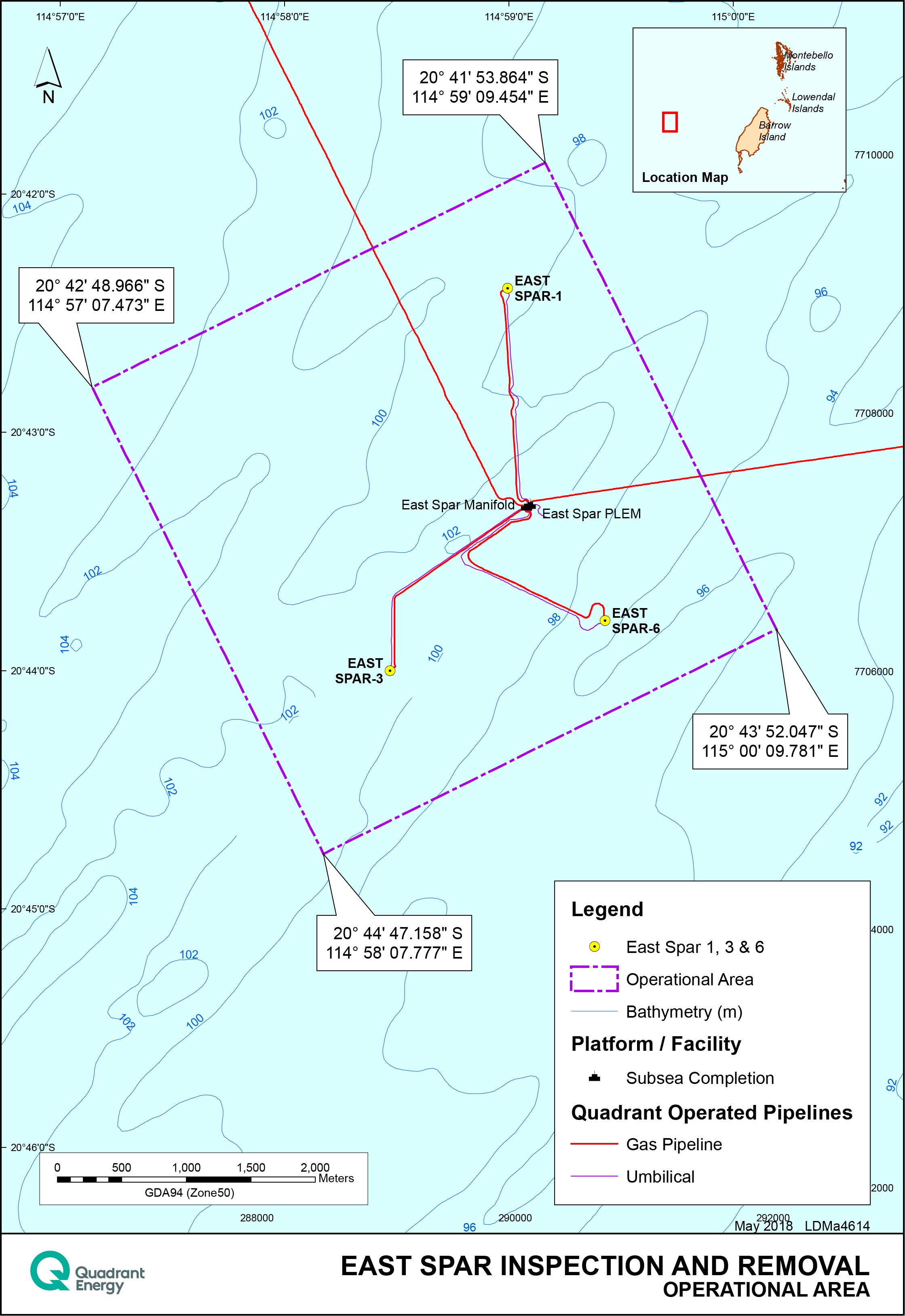 A revision of the Environment Plan has been submitted for activities to occur in 2019. Quadrant Oil Australia Pty Ltd (QOA) is the registered operator for Petroleum Production Licence WA-13-L in offshore Commonwealth waters on the North West Shelf (NWS) of Western Australia (WA). QOA is 100% owned subsidiary of Quadrant Energy Australia Ltd (Quadrant). Quadrant proposes to install infrastructure required to perform intelligent pigging (inspection) activities of the East Spar system, and remove flowlines and associated infrastructure which are at the end of design life and no longer used in production. The East Spar Inspection and Removal activities will be carried out using a Dive Support Vessel (DSV) or Installation Support Vessel (ISV). Installation of infrastructure is required to allow intelligent pigging activities to inspect the East Spar system, prior to removal of flowlines and associated infrastructure of the East Spar 1, 3 and 6 Production System. |