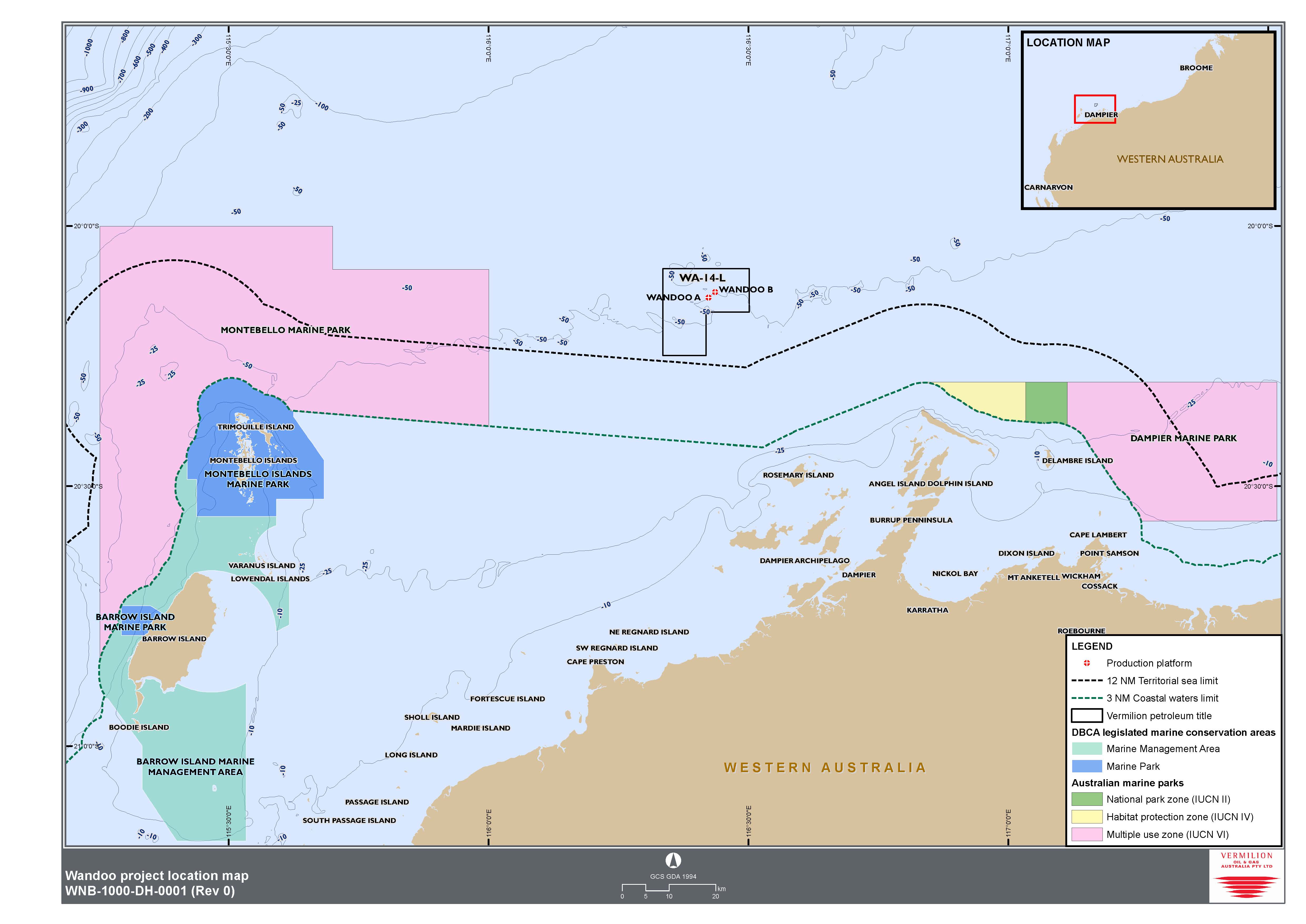 Vermilion Oil & Gas Australia Pty Ltd (VOGA) is the licensed permit holder of production licence area WA-14L, which contains the Wandoo Production Facility. The Permit Area is located in Commonwealth waters in the Carnarvon Basin off the northwest coast of Western Australia, approximately 80 km northwest of Dampier and 110 km northeast of Barrow Island in water depths of approximately 54 m. The Wandoo Field was discovered in 1991. Extraction of crude oil commenced in 1993 from a single unmanned monopod wellhead platform (Wandoo A) supporting a helideck and five production wells. In 1997, the Wandoo B production platform was installed and connected to Wandoo A by a subsea production pipeline. The Wandoo B production platform is supported on four concrete shafts that are attached to a Concrete Gravity Structure (CGS) that is comprised of ballast, product storage and water cells. The CGS sits on the seabed. The oil produced from Wandoo A is piped to the Wandoo B production platform. Oil is stored and then offloaded through flexible pipelines to a Catenary Anchor Leg Mooring (CALM) Buoy located 1.2 km north of the Wandoo B platform. A floating hose is used to transfer the oil from the CALM Buoy to export tankers moored to the CALM Buoy. Export tankers are chartered to offload the oil approximately every three to five weeks, depending on production rates and market requirements. Duration of export activity is typically 24-48 hours depending on the export cargo size and transfer rate. VOGA has been operating in the Permit Area since 2005. |