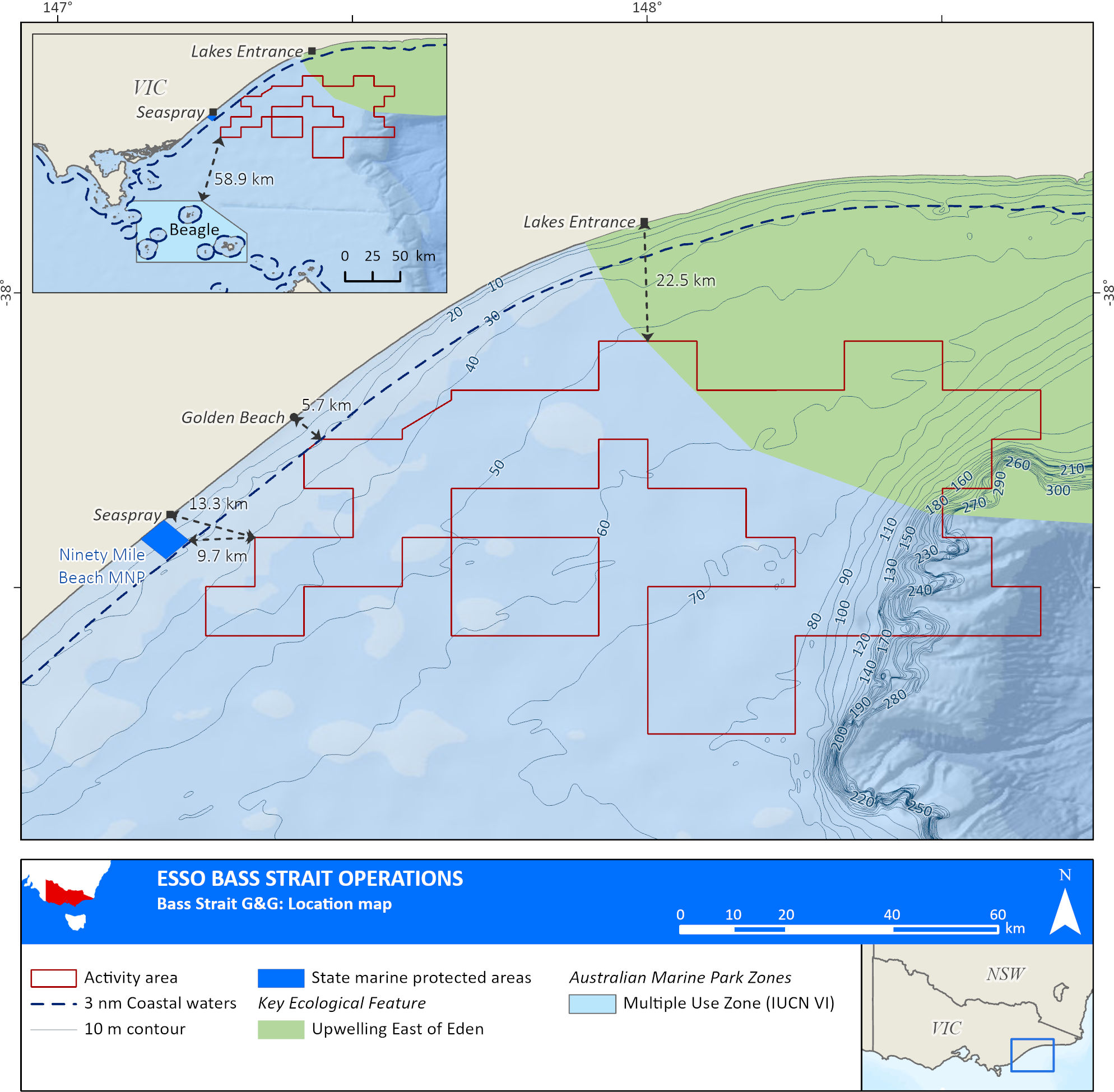 Esso plans to continue to undertake Geophysical and Geotechnical investigations within existing production licence and retention lease areas. The investigations will consist of a number of individual campaigns to inform a number of prospective future activities in the Gippsland basin. These include: • development of new and existing gas fields • development around existing facilities • plug and abandonment • decommissioning; and • drilling. The activity will take place in Production Licences VIC/L01, VIC/RL1, VIC/L02, VIC/L03, VIC/L04, VIC/L05, VIC/L06, VIC/L07, VIC/L08, VIC/L09, VIC/L10, VIC/L11, VIC/L13, VIC/L14, VIC/L15, VIC/L16, VIC/L17, VIC/L18, VIC/L19, VIC/L20, and VIC/L25, located in the Gippsland Basin of the eastern Bass Strait. The proposed seabed surveys will be carried out during the life of the EP 5 years from the date of accepted EP. The G&G surveys are estimated to take up to a maximum of 180 days per year. Geophysical investigations are proposed to be undertaken using the following conventional techniques: • single beam echo sounder (SBES) • multi beam echo sounder (MBES) • side scan sonar (SSS) • sub bottom profiler (SBP) including Ultra high resolution (UHR) • magnetometer • sound velocity profiler (SVP) • pipe tracking system (PTS) • subsea photogrammetry. Geotechnical sampling proposed are: • Cone penetrometer testing (CPT) • Drop coring or vibrocore • Borehole sampling/coring • In situ thermal conductivity tests In addition, seabed imagery, and sediment and water samples will be undertaken at representative locations to collect baseline data. Seismic surveys are not included in the activity scope. |