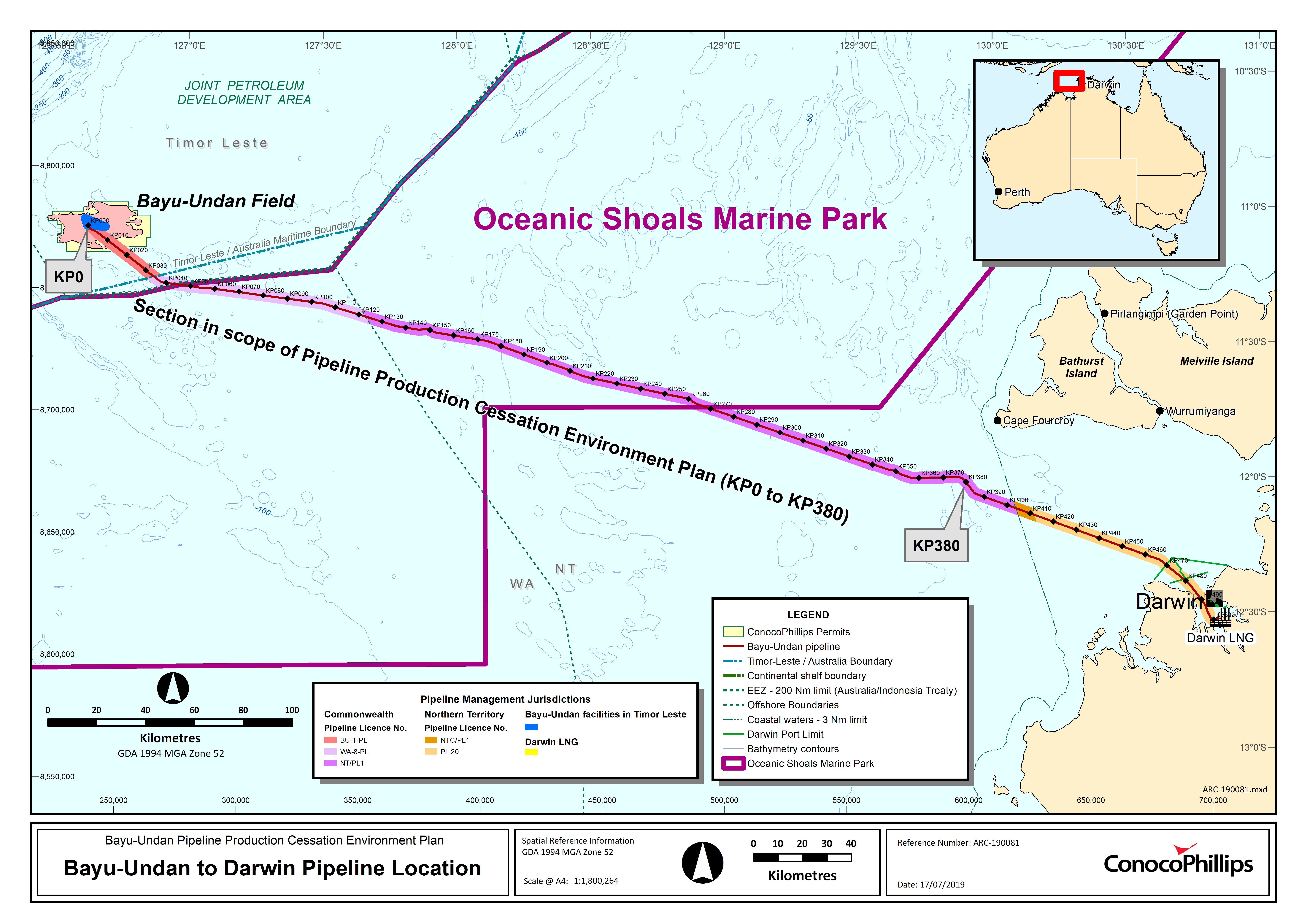 ConocoPhillips Pipeline Australia Pty Ltd (COPPA) is the operator of the existing Bayu-Undan to Darwin Gas Export Pipeline (herein referred to as the Pipeline) in the Timor Sea. The Pipeline transports dry natural gas export from the Bayu-Undan Field located in Timor-Leste waters to the Darwin liquefied natural gas (DLNG) Plant near Darwin, Northern Territory (NT), Australia. The Pipeline has been in operation since 2005. The Bayu-Undan Field is approaching the end of its commercially productive life. In anticipation of the end of Bayu-Undan production, the DLNG infrastructure owners are currently assessing multiple options to backfill the facility’s existing LNG train. One option for new supply of feed gas from 2023 is connection of a new upstream gas supply at Kilometre Point (KP) 380. Accordingly, COPPA is preparing to decommission the Pipeline between the Bayu-Undan Field (KP0) and the future location of a tie-in valve skid (KP380) for an upstream party to connect to. In preparation for decommissioning of this section of the Pipeline, COPPA intends to cease production, isolate the Pipeline upstream of KP0 and at KP380, cut and remove sections of the Pipeline at KP380 and install either an end cap or an upstream skid with pig launcher/receiver (PLR) at KP380. Once these activities are completed, the Pipeline section KP0 to KP380 will be retained in place on the seabed, pending a subsequent decommissioning program and Environment Plan submission. These activities, including retention of the Pipeline in place, are referred to as Production Cessation. Production Cessation activities for the Pipeline section KP0 – KP380 will occur after the end of Bayu-Undan field life, which may occur between 2021 and 2023, prior to final decommissioning. It is anticipated that this production cessation activity will take place as a 4 – 6 week subcomponent of an approximately 12-week campaign, or as the initial 4 – 6 week phase of a split 12 week campaign after end of Bayu-Undan field life. Campaign activities on the downstream end of the cut pipeline at KP380 will be the subject of a separate EP. |