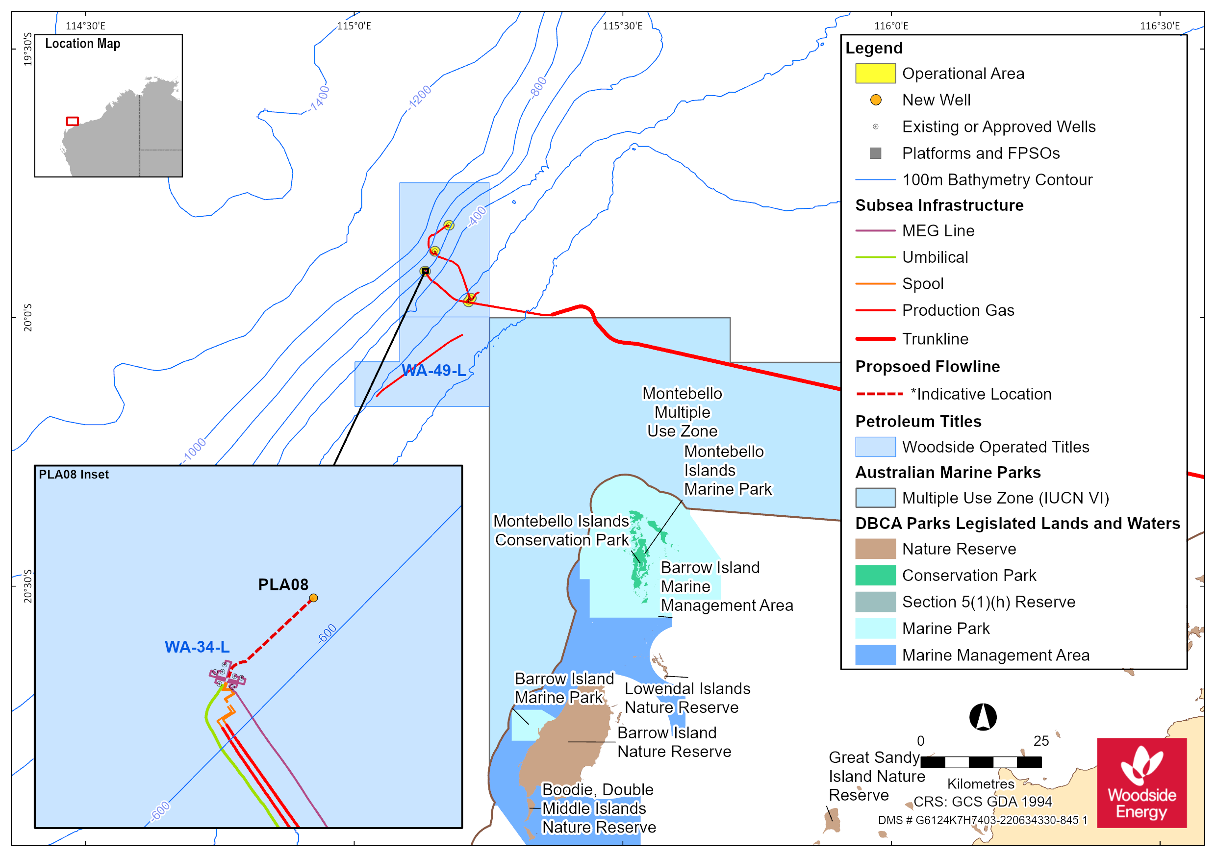 Woodside currently produces hydrocarbons from the Pluto, Pyxis and Xena fields in Production Licence WA-34-L. This Environment Plan (EP) is a revision to the previously accepted WA-34-L Pyxis Drilling and Subsea Installation EP to include drilling and the development of one Pluto infill production well (PLA08). If required, Woodside will also include contingent activities including well intervention workover or re-drill of the Pluto, Pyxis and Xena production wells (PLA01 to PLA08, PYA01 and PL-PYA02, and XNA01 and XNA02) within Permit Area WA-34-L to monitor and maintain their integrity. The proposed PLA08 well will be tied back to the Pluto platform and operated under the accepted Pluto Facility Operations Environment Plan. The activities will be undertaken in Commonwealth waters around 170km north-west of Dampier and 50km south-east of the Montebello Islands, in permit area WA-34-L. The proposed PLA08 well will be located at approximately 820m water depth and will be tied back to the existing Pluto manifold by approximately 300m flexible jumper lines. PLA08 drilling and subsea installation activities are currently anticipated to commence in November 2023 and are expected to take approximately 50 days to complete. Installation of the subsea connections and cold commissioning is anticipated to commence within 1-9 months from when the well has been completed and is expected to have a cumulative duration of about 4 weeks. Well intervention or workover activities may require up to 70 days per well and may be carried out at any time during the in-force period of the EP, but only if required. The timing and duration of the proposed activities is subject to change due to project schedule requirements, vessel availability, weather or unforeseen circumstances. The duration of the EP is for two years, and all activities will be completed by 30 November 2025. |