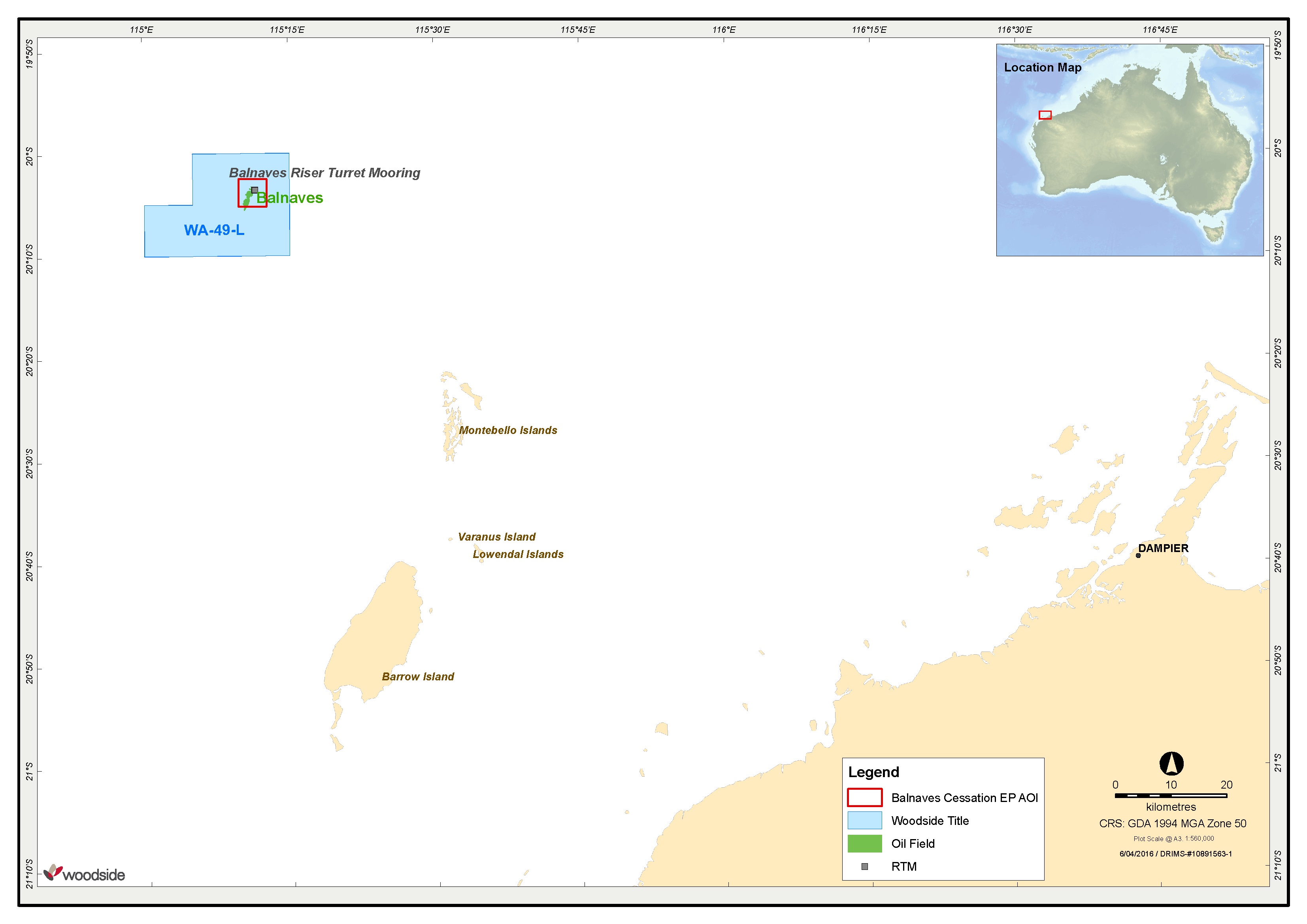 Woodside is seeking environmental approval to undertake petroleum activities to support the cessation of operations from the Balnaves oil field. The Balnaves infrastructure is located in production licence WA-49-L in Commonwealth waters. The Balnaves oil field is about 48 km north-west of the Montebello Islands and 75 km north-west of Varanus Island. Water depths over the field vary from 110 m to 160 m.