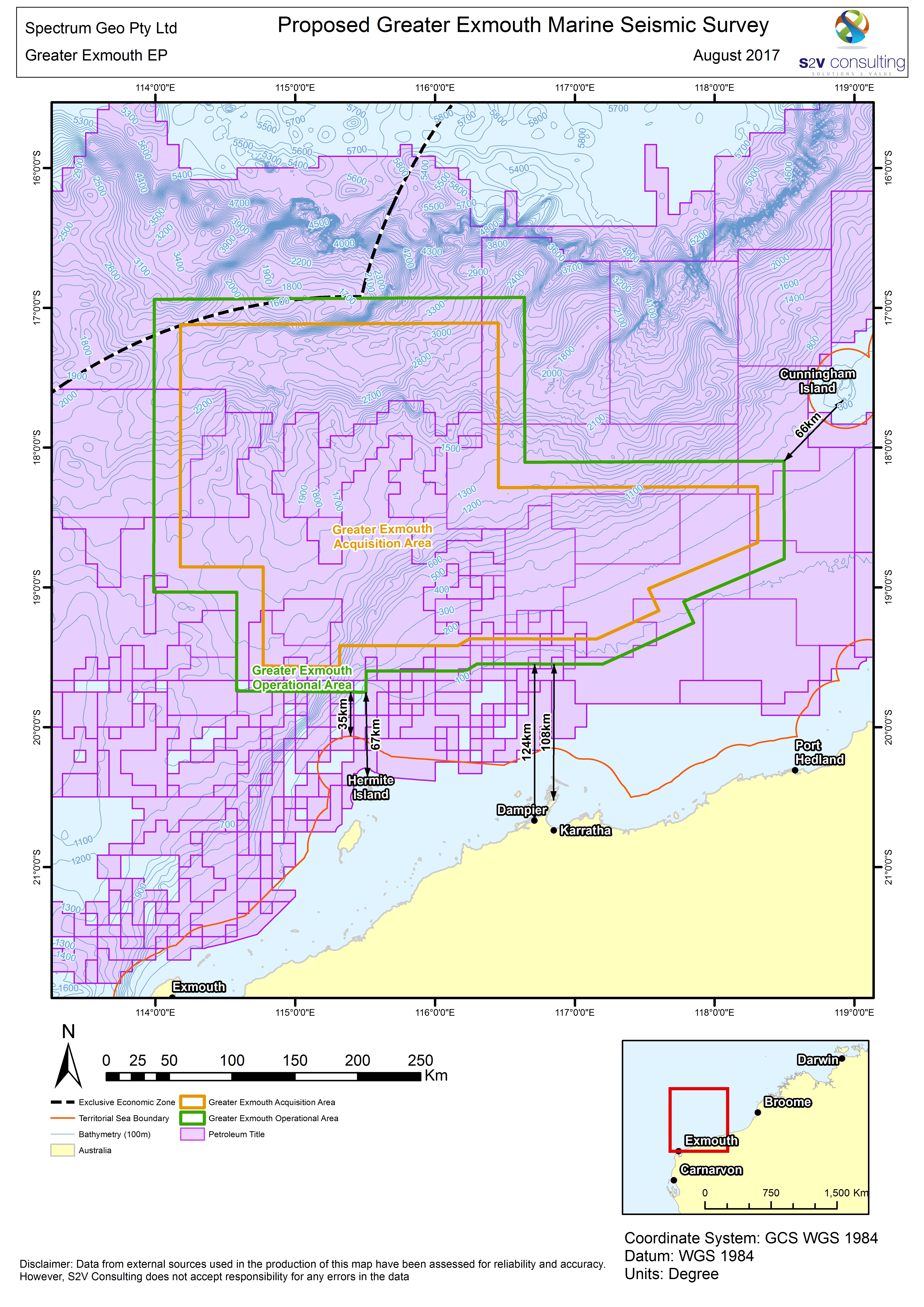 In the North-west Marine Region (NWMR) offshore from Western Australia (WA), the geophysical company Spectrum Geo Pty Ltd (Spectrum) proposes to acquire multi-client marine seismic surveys (MSS) within the Greater Exmouth operational area. The Greater Exmouth operational area comprises of an area of approximately 105,600 square kilometres (km2) of Australian Commonwealth waters. The Greater Exmouth MSS may be acquired as a single survey, or as separate surveys (not concurrently) depending on weather, vessel availability and regulatory and operator financial approvals. At the closest point, the southern boundary of the operational area is ~ 67 km from the nearest land (Hermite Island) and ~ 124 km from the mainland coastline (Dampier town). South of the operational area are the Montebello Islands Commonwealth marine reserve boundary (~28 km away) and Barrow Island marine management area (~80 km away). The northeast corner of the operational area overlaps with the multiple use zone of the Argo-Rowley Terrace CMR and is ~50 km to the boundary of the Argo-Rowley Terrace CMR Marine Park zone (IUCN zone II). The Greater Exmouth operational area excludes WA State waters. Water depths throughout the operational area range from 33–3,300 m, and seismic activities will not occur in water shallower than 100 m, or within 12 km of the Glomar shoals. Operational DetailsIn terms of technical methods and procedures, the proposed MSS will be similar to others conducted in Australian marine waters. No unique or unusual equipment or operations are proposed. The proposed MSS will be undertaken using a purpose-built, seismic survey vessel. During the proposed activities, the survey vessel will traverse a series of pre-determined sail lines within the operational area at a speed of approximately 8–9 km/hour. The operating pressure for the acoustic source will be approximately 2,000 psi with a maximum volume of 4,350 cubic inches.Timing of the ActivityThe Greater Exmouth EP is designed for a duration of three years. The timing of commencement and duration of individual surveys have not yet been determined, but the first survey (once the EP is accepted) will not occur before Q4 2017. The MSS activity will also not occur during peak pygmy blue whale migration periods. Furthermore, the commencement of each survey will be dependent on fair sea state conditions suitable for marine seismic acquisition, vessel(s) availability, client data schedule requirements and granting of approvals from the appropriate government bodies.