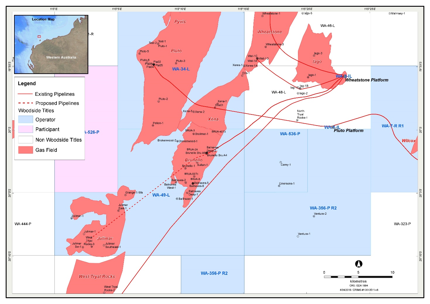 The Petroleum Activities Program will be carried out using a moored semi-submersible MODU, pipelay vessel, installation vessels and a variety of support vessels, and is anticipated to commence in Q4 2019 and be completed in 2022. The proposed activities are located within Production Licence WA-49-L, approximately 185 km offshore from Dampier on the north west coast of Western Australia, with the closest landfall being the Montebello Islands, approximately 48km to the south.