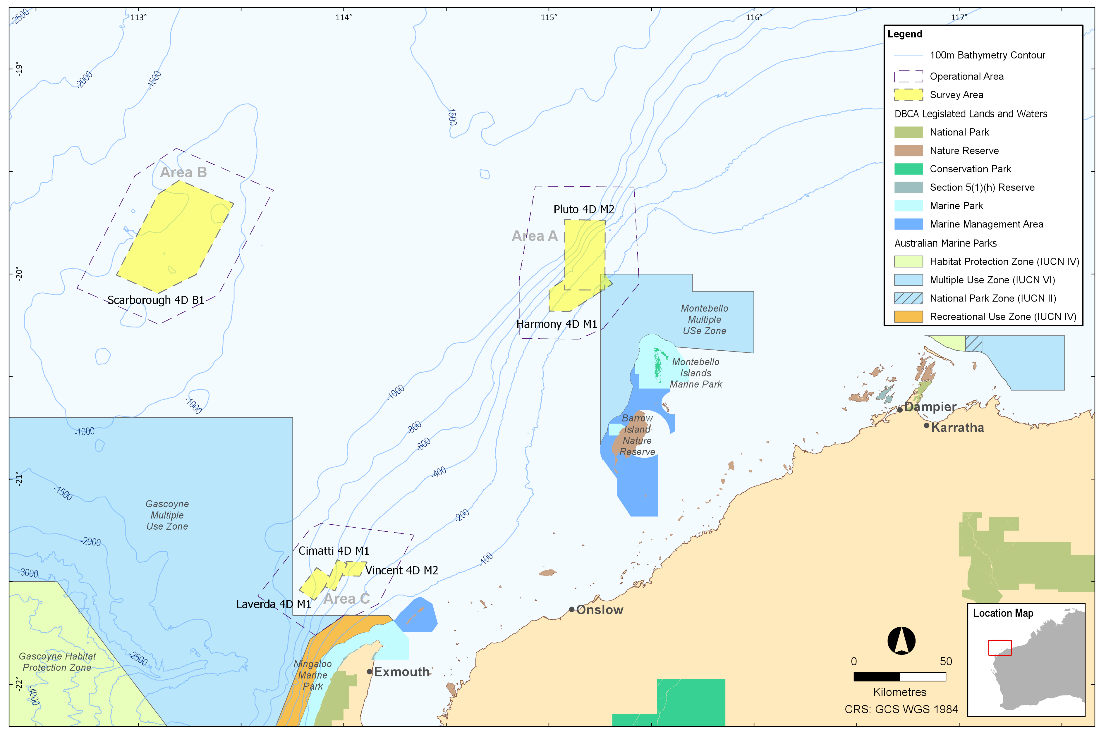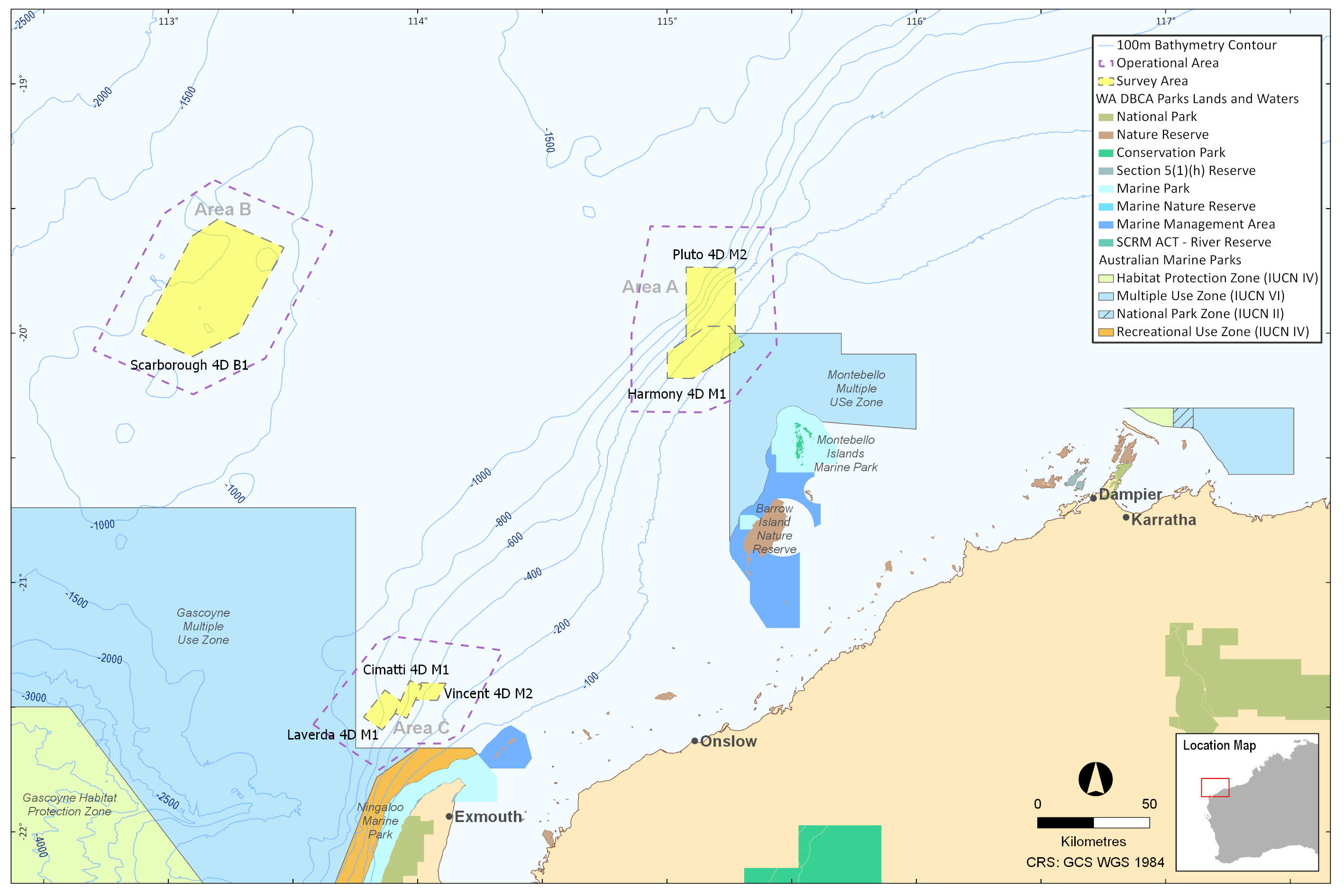 Woodside is planning to conduct a series of marine seismic surveys in three separate geographical areas of Commonwealth waters in North-west Australia, Area A: Pluto/Brunello (Harmony 4D M1); Area B: Scarborough; and Area C: Vincent/Laverda/Cimatti.