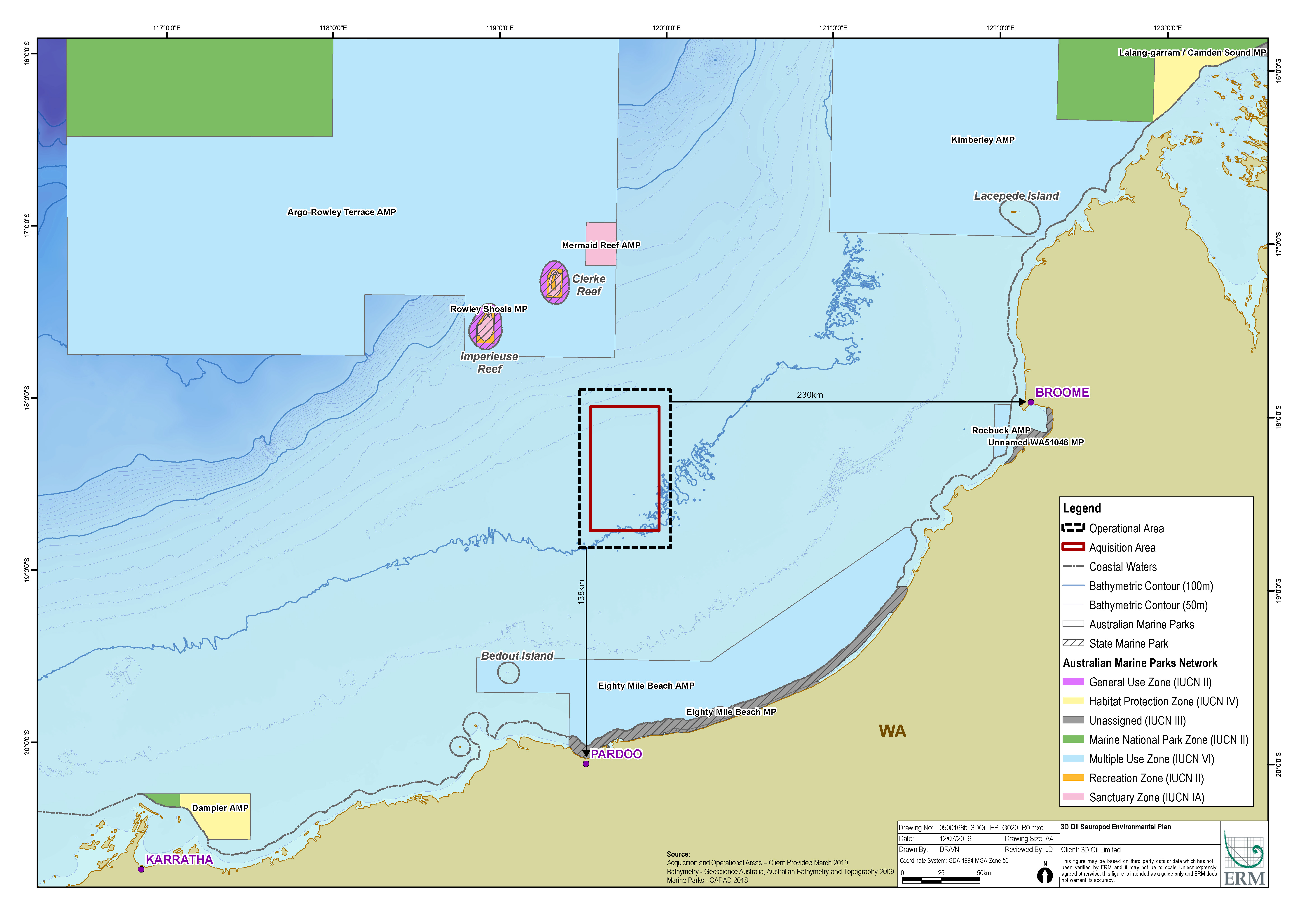 3D Oil Limited (3D Oil) is proposing to undertake the Sauropod three-dimensional (3D) marine seismic survey (MSS) in Commonwealth waters of the Roebuck Basin, within exploration permit WA-527-P. The purpose of the Sauropod 3D MSS is to collect high quality geophysical data about rock formations and structures beneath the seabed and assess potential for new oil and gas discoveries.