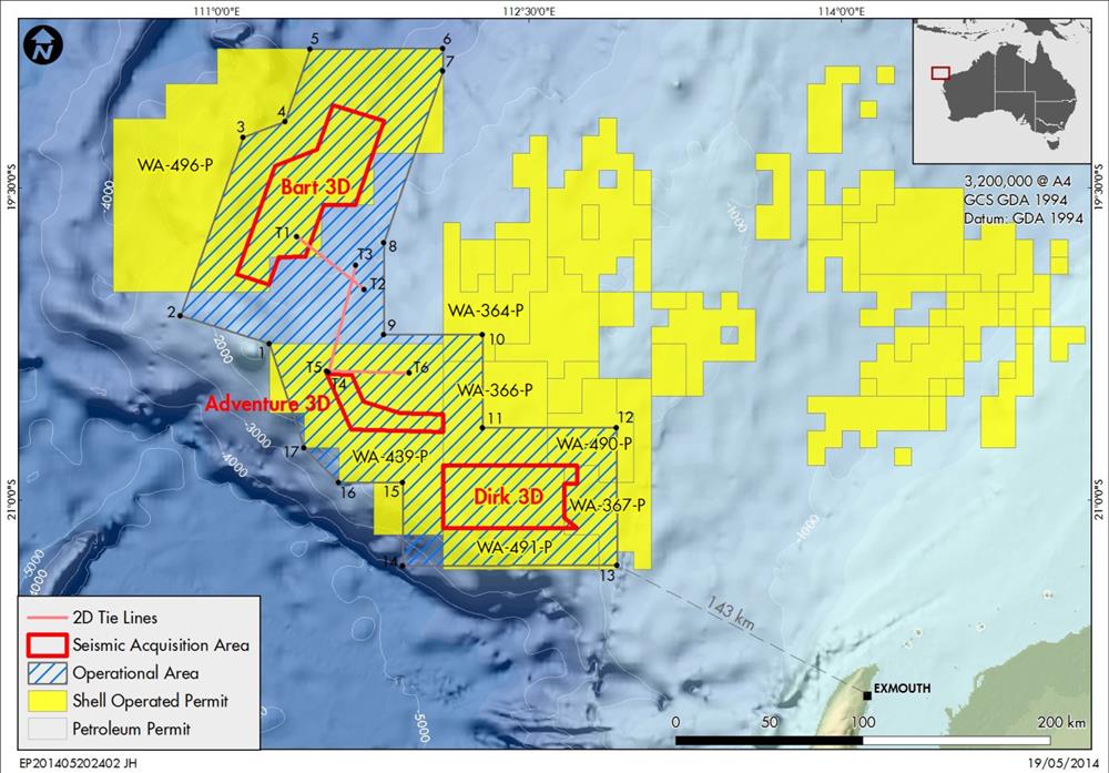 The Dirk Adventure Bart 3D Marine Seismic Survey (DAB 3D MSS) will take place within an operational area of approximately 27,159 km2 that is situated within three separate permit areas, WA-496-P, WA-439-P and WA-491-P. The operational area is located entirely within Commonwealth waters, 128 km northwest of Ningaloo Reef and 110 km northwest of the Commonwealth Ningaloo Marine Park boundary.