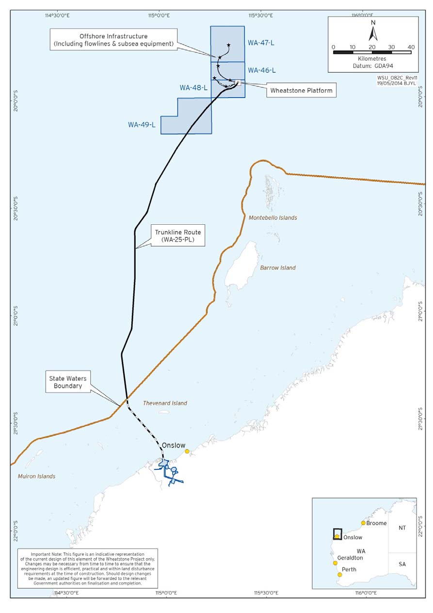 The activities will be performed at the location of the Wheatstone Platform (WP). The WP is located at 330 860 E and 7 795 520 N (UTM Zone 50). These coordinates are based on the Geodetic Datum of Australia (GDA94).