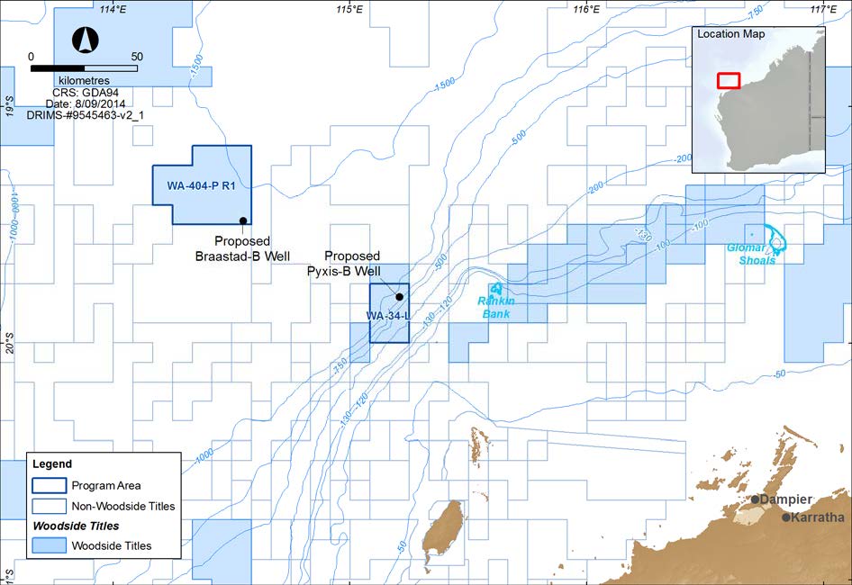 The proposed Petroleum Activities Program is located in production licence WA-34-L (Pyxis) and exploration permit WA-404-P (Braastad) in Commonwealth waters, located approximately 170 and 260 km (respectively) north-west of Dampier and approximately 66 and 137 km (respectively) north, north-west from the nearest shoreline (Montebello Islands).