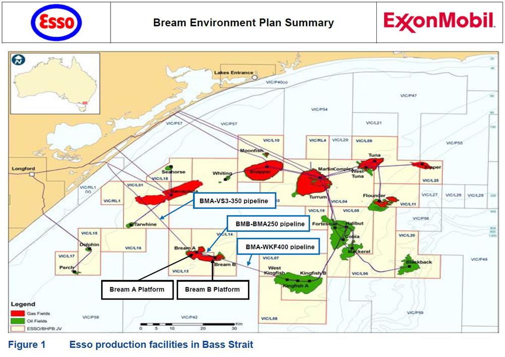 The Bream A (BMA) platform is located approximately 46 km off the Gippsland coast in approximately 59 m of water depth. The Bream B (BMB) platform is located approximately 51 km off the Gippsland coast in approximately 61 m of water depth.