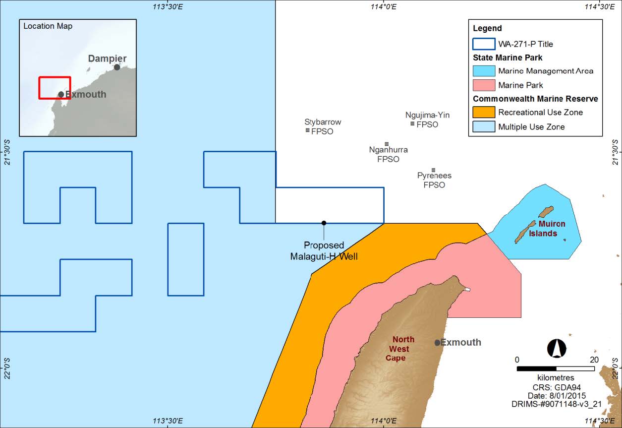 The proposed activity area is located in permit area WA-271-P, Exmouth Sub-basin, Western Australia, offshore in Commonwealth waters, approximately 65 km north-west of Exmouth.