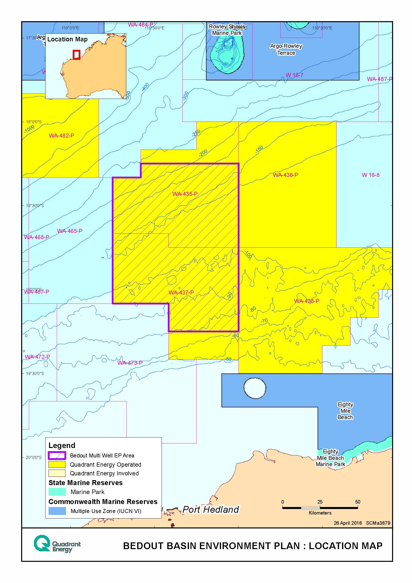 Quadrant Energy plan to explore and appraise for hydrocarbons in the Bedout Basin region in Commonwealth waters within permit areas WA-435-P and WA-437-P through the drilling of a series (up to 10) of exploration and appraisal wells. This EP covers drilling, evaluating, well testing, and abandonment activities related to exploration and appraisal drilling, utilising either jack-up or semi-submersible MODUs.
