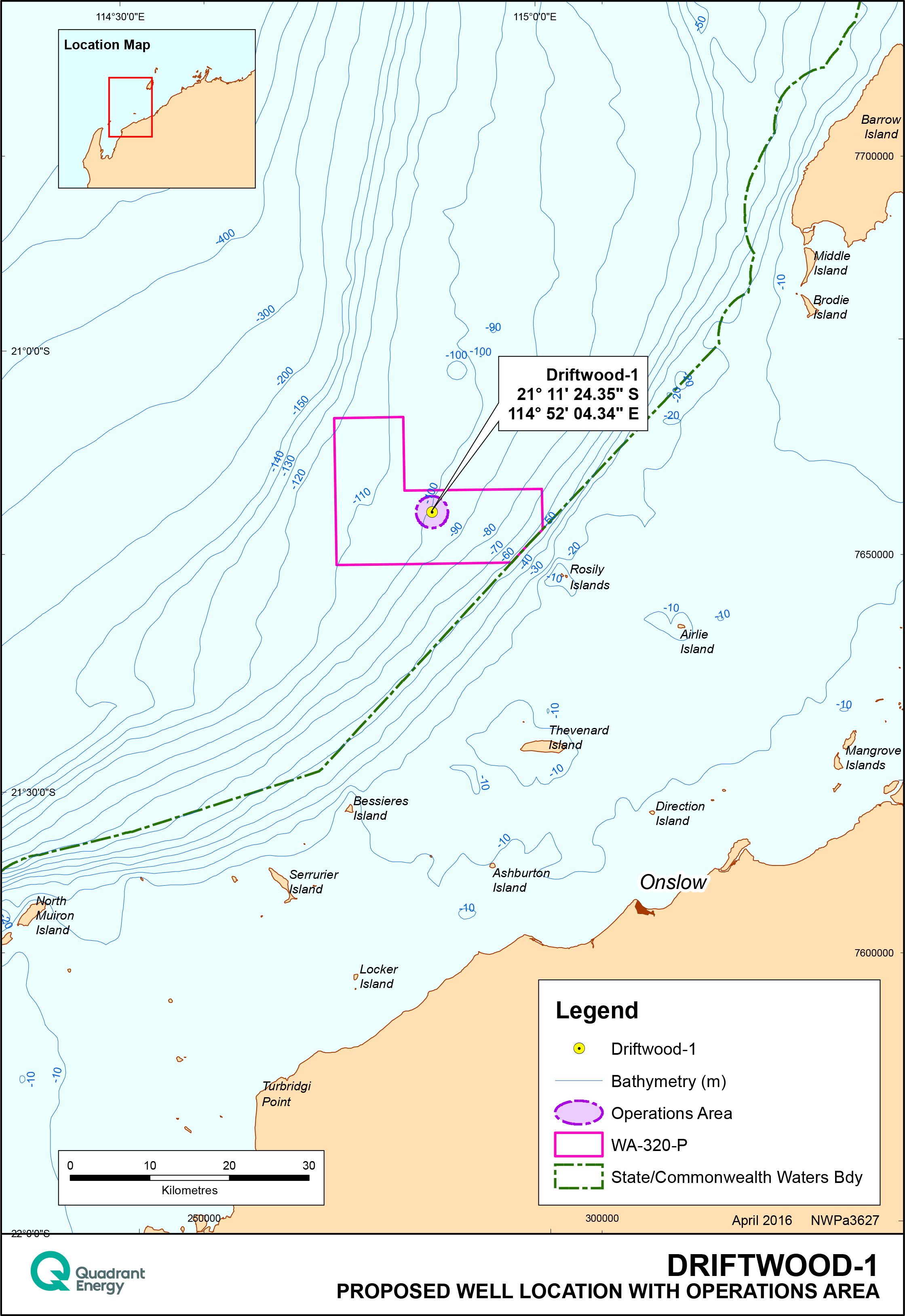 Quadrant Energy proposes to drill the Driftwood-1 exploration well, located in Commonwealth permit area WA-320-P off the coast of Western Australia. This environment plan covers all jack-up mobile offshore drilling unit (MODU), support vessel and helicopter operations within the permit area. The primary reservoir target is oil. The exploration well will be plugged and abandoned (P&A) prior to MODU departure.