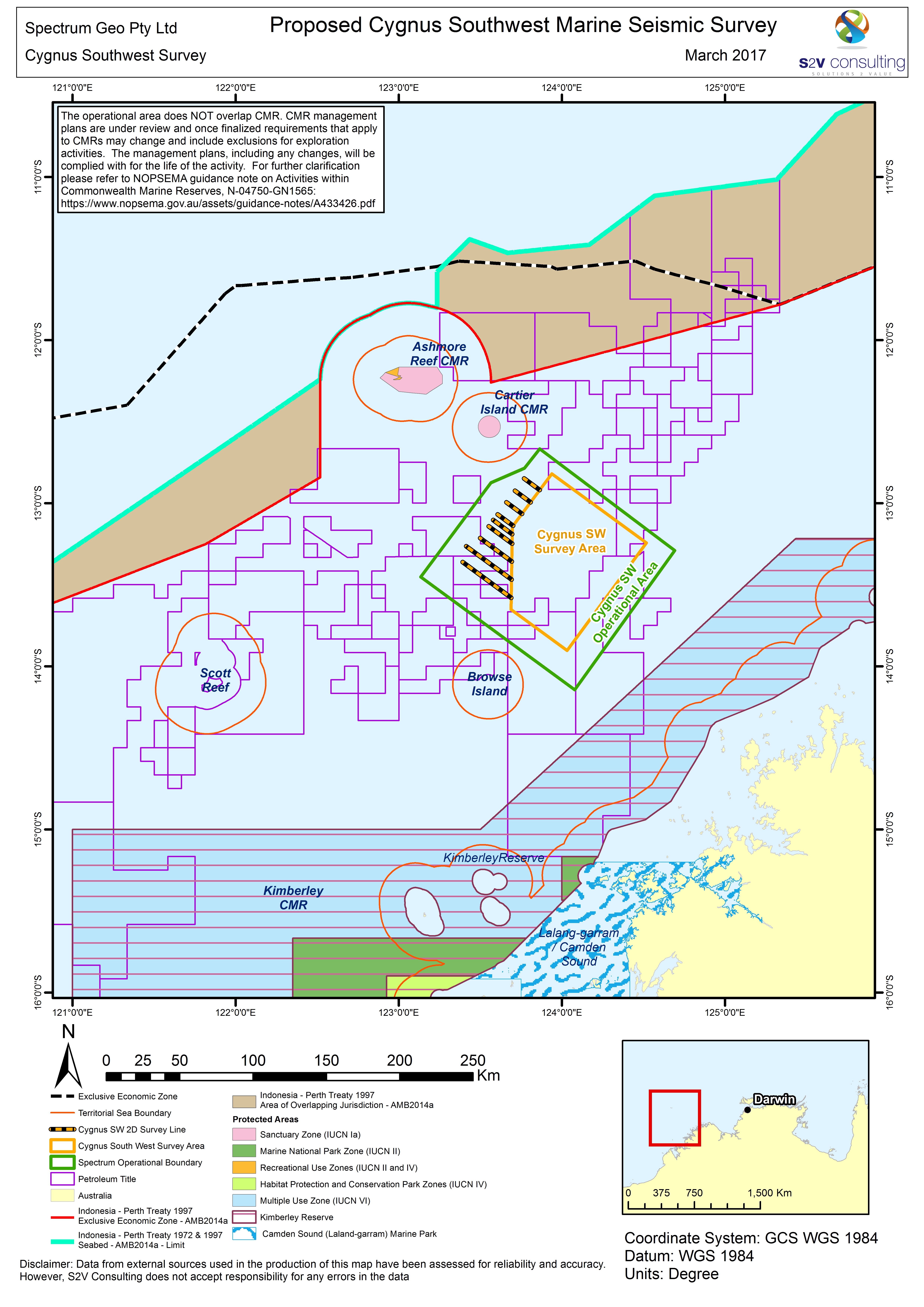 Spectrum proposes to conduct a 2D and 3D seismic survey in the Browse Basin. No unique or unusual equipment or operations are proposed. The survey will be conducted using a purpose-built seismic survey vessel. The maximum survey area extent is approximately 6,331km2 over the 3D survey area, and includes a total of 191 km over the nine identified 2D sail lines and is located entirely within Commonwealth waters. The survey vessel will not enter State waters or Commonwealth Marine Reserves at any point during the activity. Water depths in the survey area are in the range of 3 to 430 m with the shallowest water depths located around Heywood shoal, however the survey vessel will not fire the seismic source in water depths of less than 30 m.