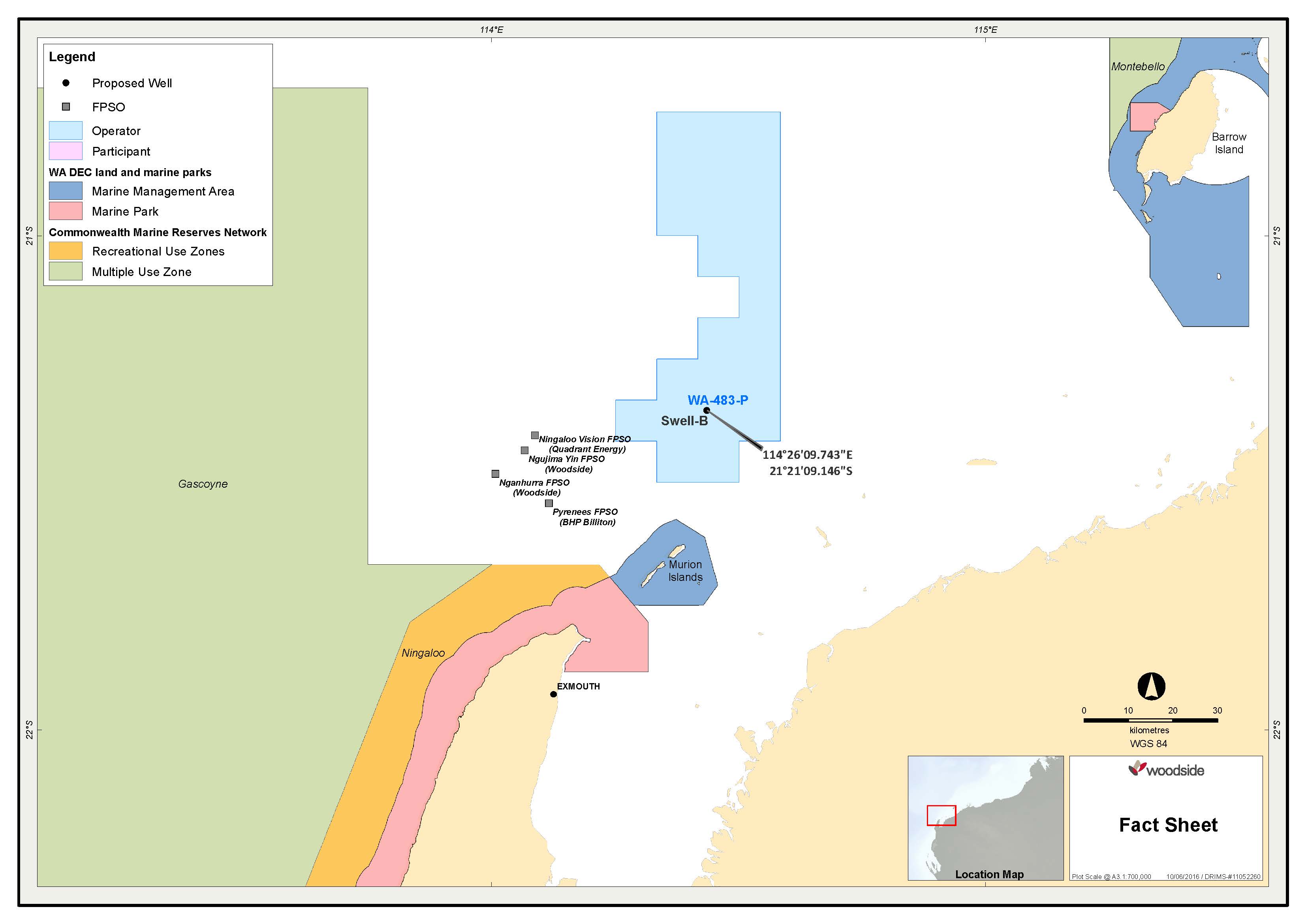 Woodside Energy proposes to drill the Swell exploration well, located in Exploration Permit Area WA-483-P off the coast of Western Australia.WA-483-P is located within Commonwealth waters and is owned 60% by Woodside (operator) and 40% by KUFPEC (Perth) Pty Ltd (WA-483-P JV). The WA-483-P JV are planning on drilling one exploration well in this permit to support permit work plan commitments issued under the Offshore Petroleum and Greenhouse Gas Storage Act 2006.