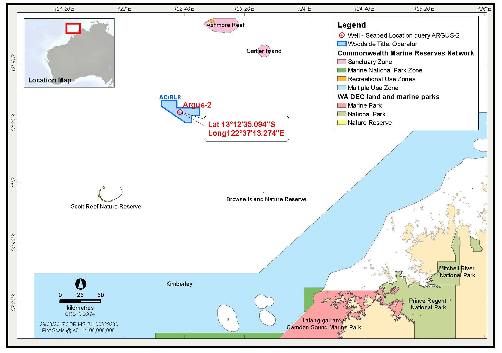 Woodside has prepared an Environment Plan for the Argus-2 well site. The Argus-2 wellhead is located in Retention Lease AC/RL8 which is located in Commonwealth waters approximately 550 km offshore north of Broome Western Australia.