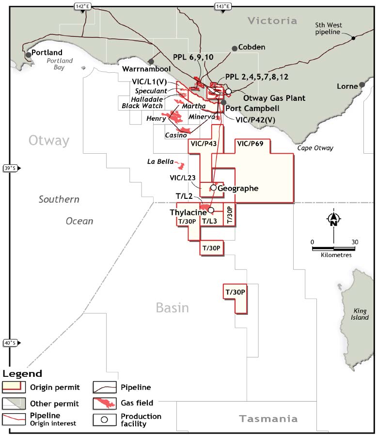 The Thylacine field is located approximately 70km offshore from Port Campbell, Victoria in approximately 100m of water and the Geographe reservoir is located approximately 55km offshore in 85m of water.Raw gas including condensate from the Geographe and Thylacine fields are processed at the onshore OGP located approximately 7km northeast of Port Campbell. The current approved field development plan [167] has an end of field life of 2026. Over this period the fields are expected to supply approximately:
