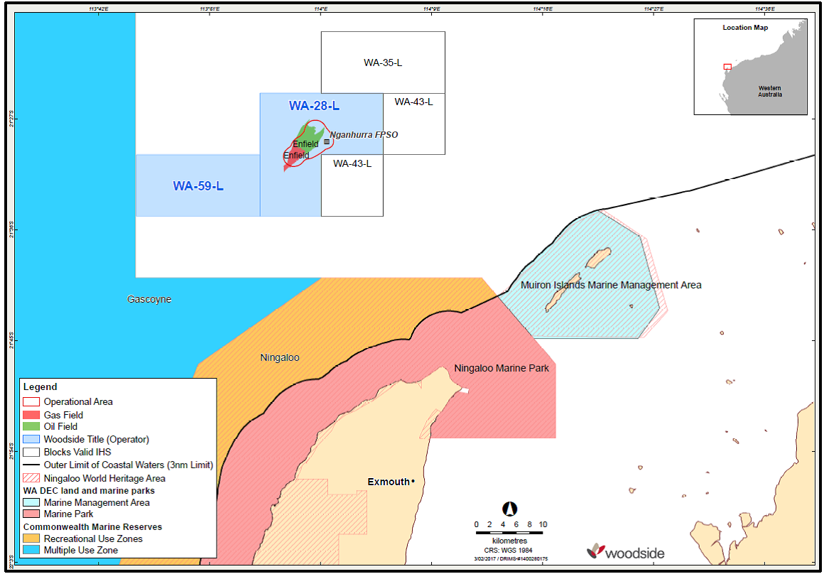 The Enfield oil field is located in production licence WA-28-L in Commonwealth waters, approximately 52 km north-west of Exmouth in Western Australia.