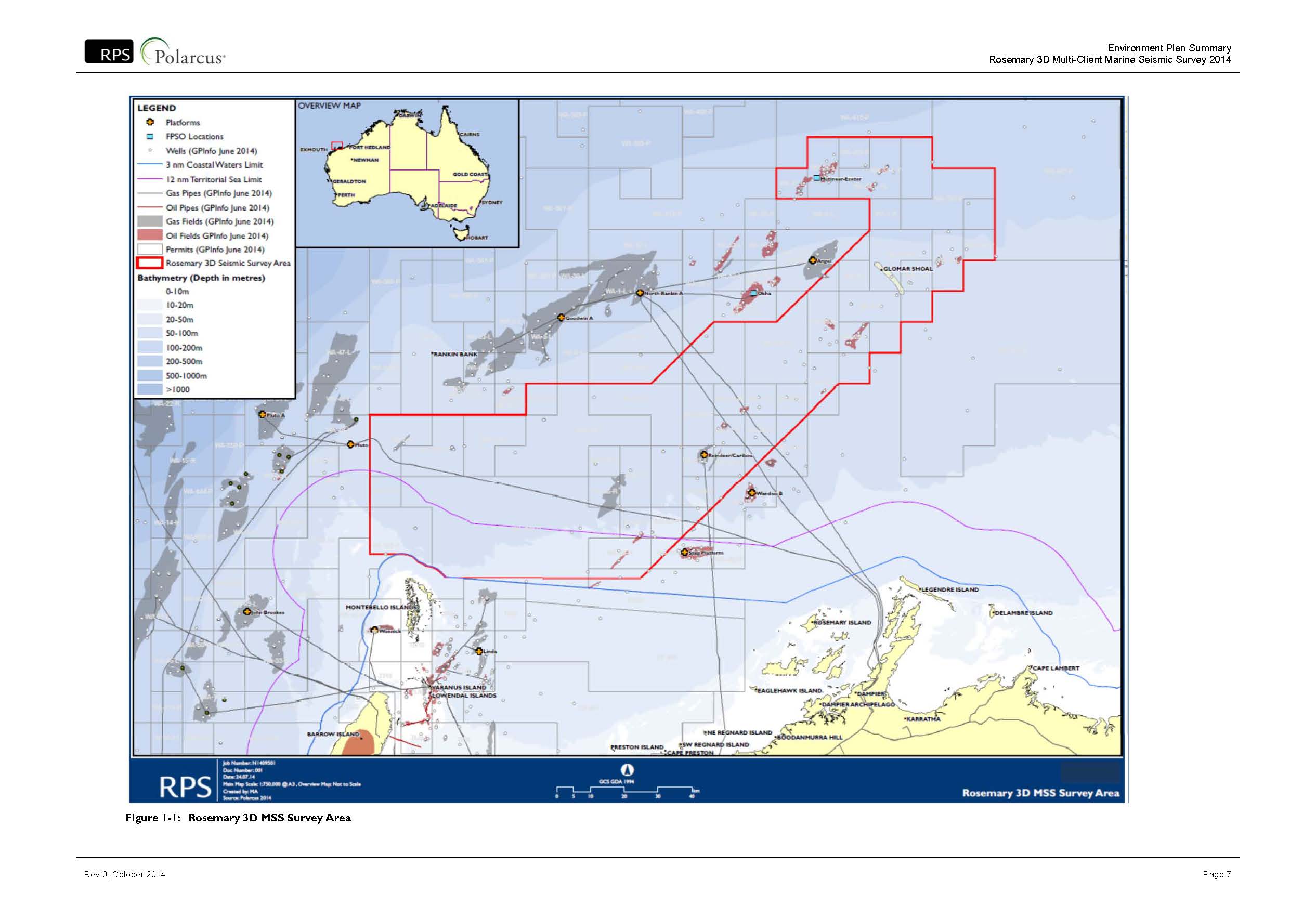 Polarcus Seismic Limited (Polarcus) proposes to undertake a multi-client 3D marine seismic survey (MSS) program, called the Rosemary 3D MSS, in Commonwealth waters on the North West Shelf, between September 2014 and March 2015. The survey acquisition area covers approximately 9.400 km2 in water depths between approximately 50 and 200 m. The survey and operational areas are bounded by the coordinates listed in Table 1-1 (see EP Summary).