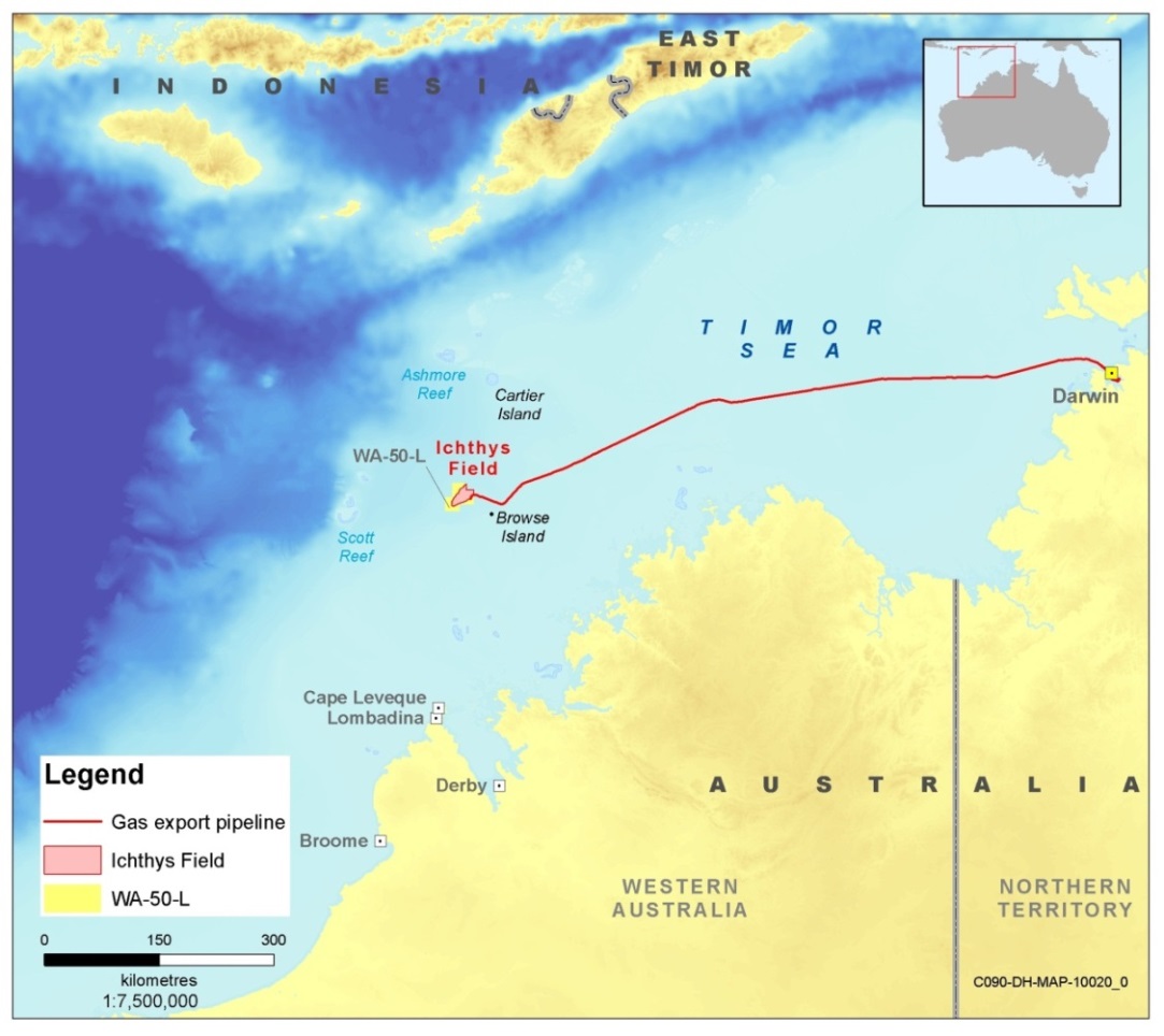 INPEX Ichthys Pty Ltd, on behalf of the Ichthys Upstream Unincorporated Joint Venture Participants, is developing the Ichthys Field in the Browse Basin off the north-west coast of Western Australia to produce condensate offshore for export to markets in Japan and elsewhere, and export gas for further processing at the Ichthys liquefied natural gas (LNG) plant in Darwin. Liquefied petroleum gases (LPGs) and LNG will be produced onshore from the export gas on behalf of the Ichthys Downstream Incorporated Joint Venture. The Ichthys Field is located within the area covered by production licence WA-50-L, in the northern Browse Basin, approximately 210 km north-west of the coast of mainland Western Australia and 820 km south-west of Darwin. Water depths range from 235 to 275 m and the field consists of two reservoirs: an upper reservoir in the Brewster Member and a lower reservoir in the Plover Formation.