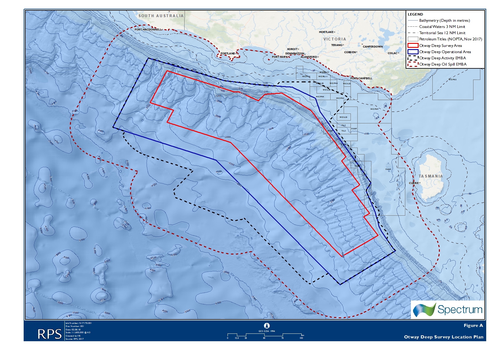 Geophysical company Spectrum Geo (Spectrum) are proposing to undertake the Otway Deep three-dimensional (3D) marine seismic survey (MSS) in the Commonwealth waters of the Otway Basin. The Otway Deep MSS is adjacent to permit areas T30/P and T49/P and predominantly sits over open acreage. The Otway Deep survey area is located entirely within offshore Commonwealth waters, approximately 42 km south of the Victorian mainland and 62 km west of King Island (Tasmania) at its closest points. Water depths within the survey area range from a minimum of 170 m to a maximum of 3,600 m. The survey area encompasses an area of 23,620 km2 and is the area within which the seismic source (airguns) will be operational and seismic data will be acquired, including soft-start procedures and line run-outs (required to obtain full fold coverage). The seismic source will not be operational outside of the survey area. An operational area or ‘buffer’ around the survey area is required for activities including streamer deployment and retrieval, maintenance and recovery, and vessel manoeuvring (line turns). There will be no discharge of the airguns within the operational area.