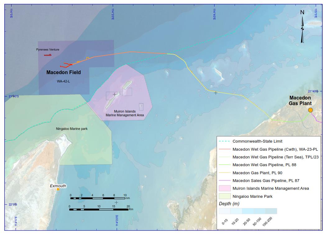 The Macedon Operations involves production of gas from the Macedon gas field via four subsea wells and associated subsea field infrastructure, with transport of the gas to an onshore processing plant via a subsea pipeline. The Macedon gas field is situated within production licence WA-42-L located on the North West Shelf in Commonwealth waters ranging from 120 to 180 m depth, approximately 40 km north of Exmouth and 100 km west of Onslow.