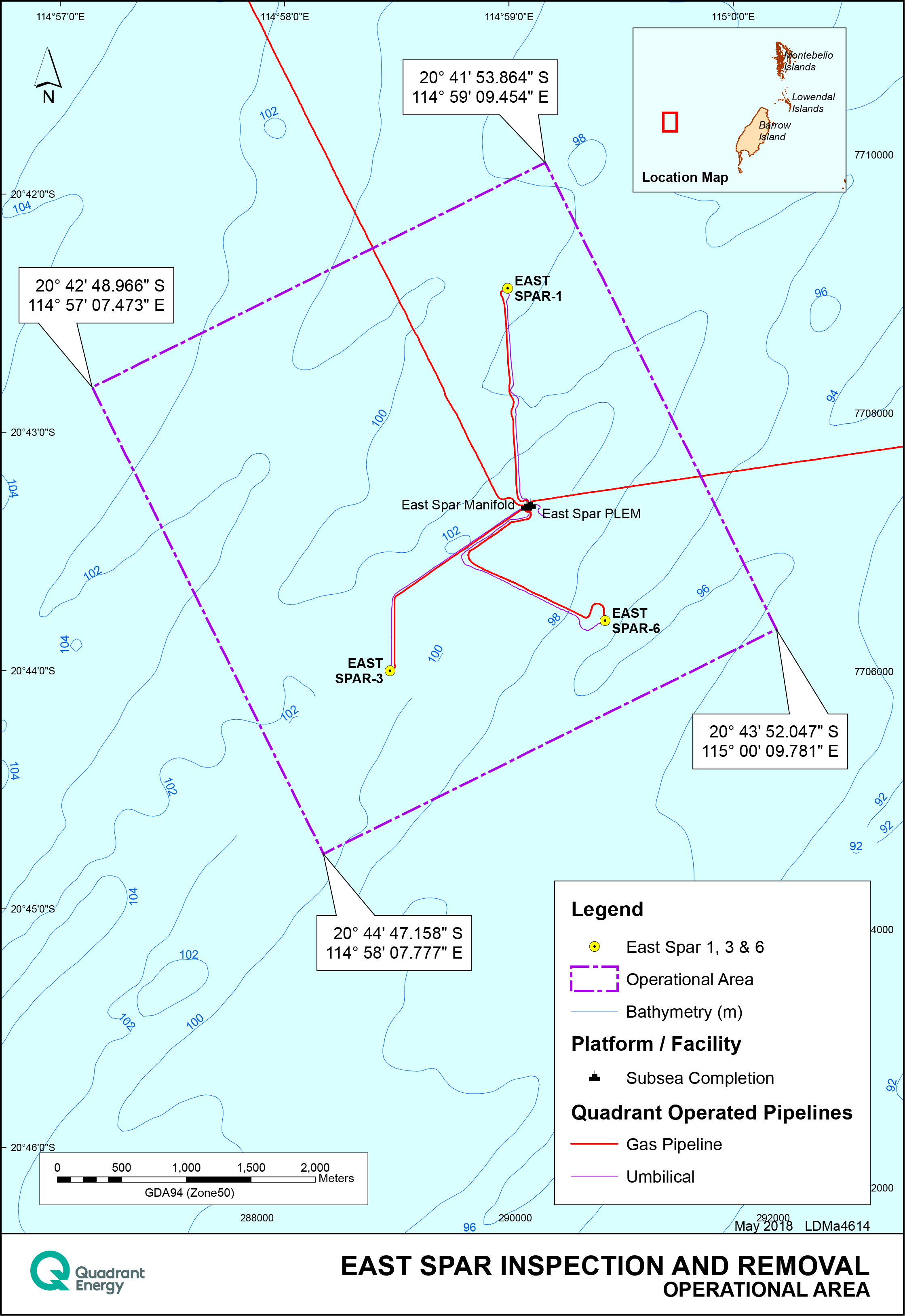 Quadrant Oil Australia Pty Ltd (QOA) is the registered operator for Petroleum Production Licence WA-13-L in offshore Commonwealth waters on the North West Shelf (NWS) of Western Australia (WA). QOA is 100% owned subsidiary of Quadrant Energy Australia Ltd (Quadrant). Quadrant proposes to install infrastructure required to perform intelligent pigging (inspection) activities of the East Spar system, and remove flowlines and associated infrastructure which are at the end of design life and no longer used in production.