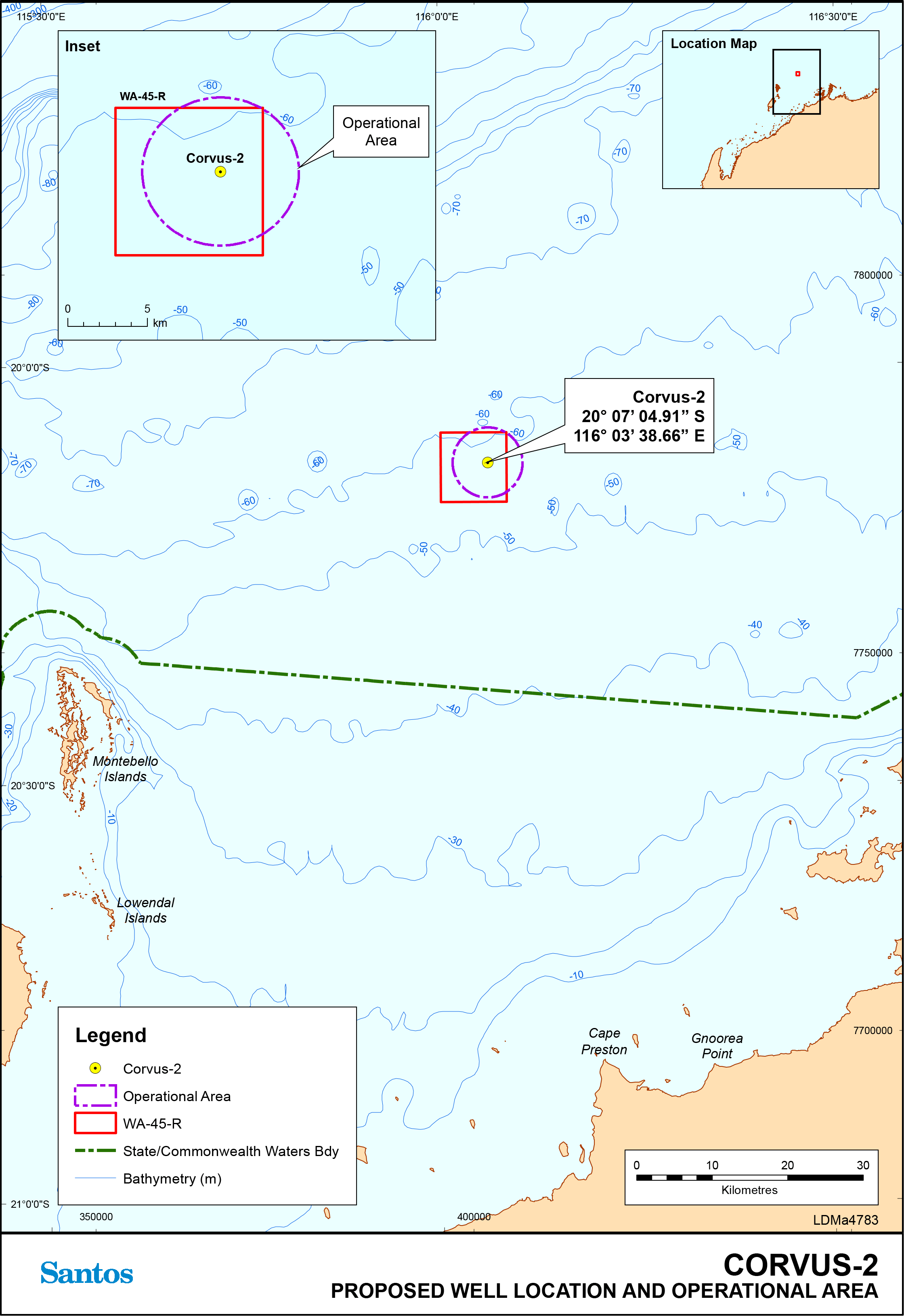 Santos Northwest Pty Ltd (Santos) proposes to drill the Corvus-2 appraisal well, located in Commonwealth waters of approximately 65 m depth off the coast of Western Australia (WA).