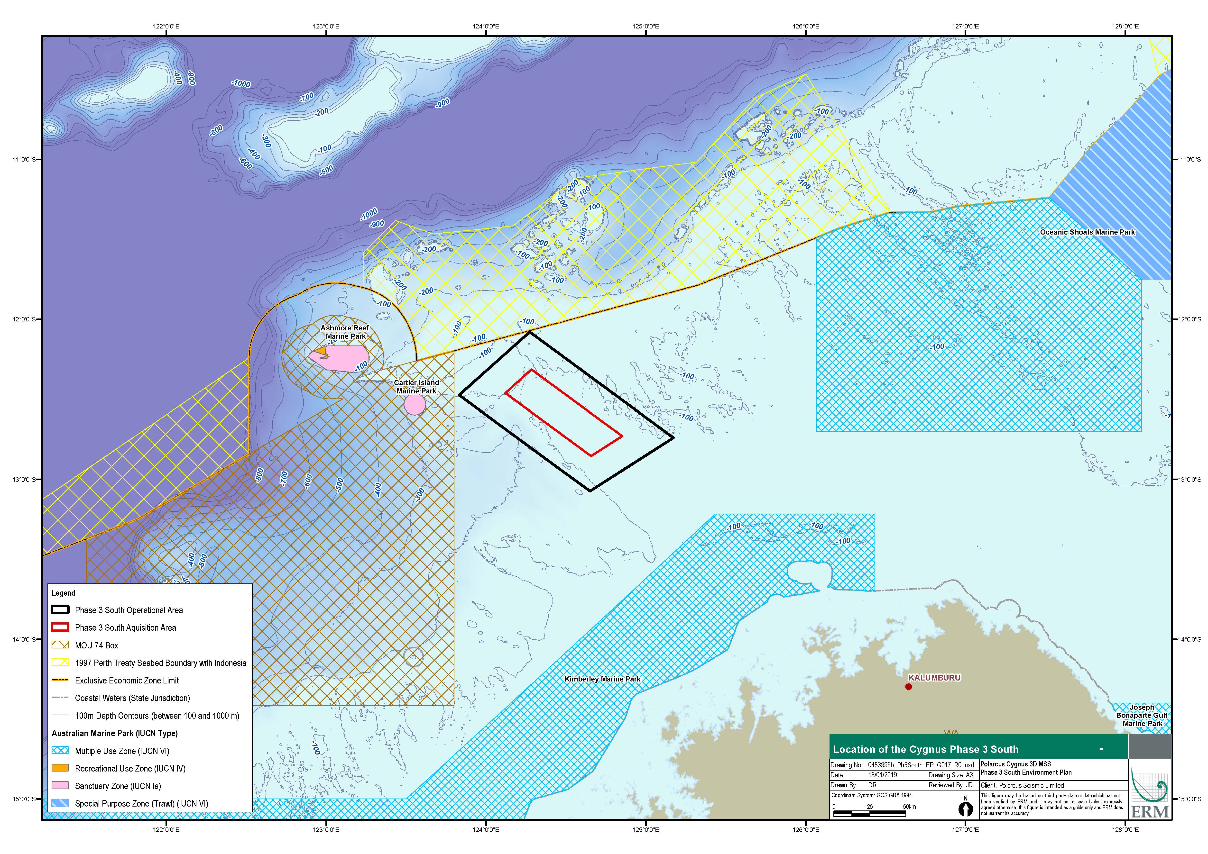 The Acquisition Area comprises the area within which 3D seismic acquisition will be undertaken and covers approximately 1,767 km². The Acquisition Area is surrounded by a larger Operational Area, for the purpose of line run-ins, run-outs, source testing, soft starts and turns etc. The Operational Area covers approximately 7,408 km2 and, at its closest, is approximately 160 km north of the Kimberley coast and 170 km south of the Indonesian Archipelago and Timor-Leste. The survey will be undertaken in water depths of up to approximately 205m.