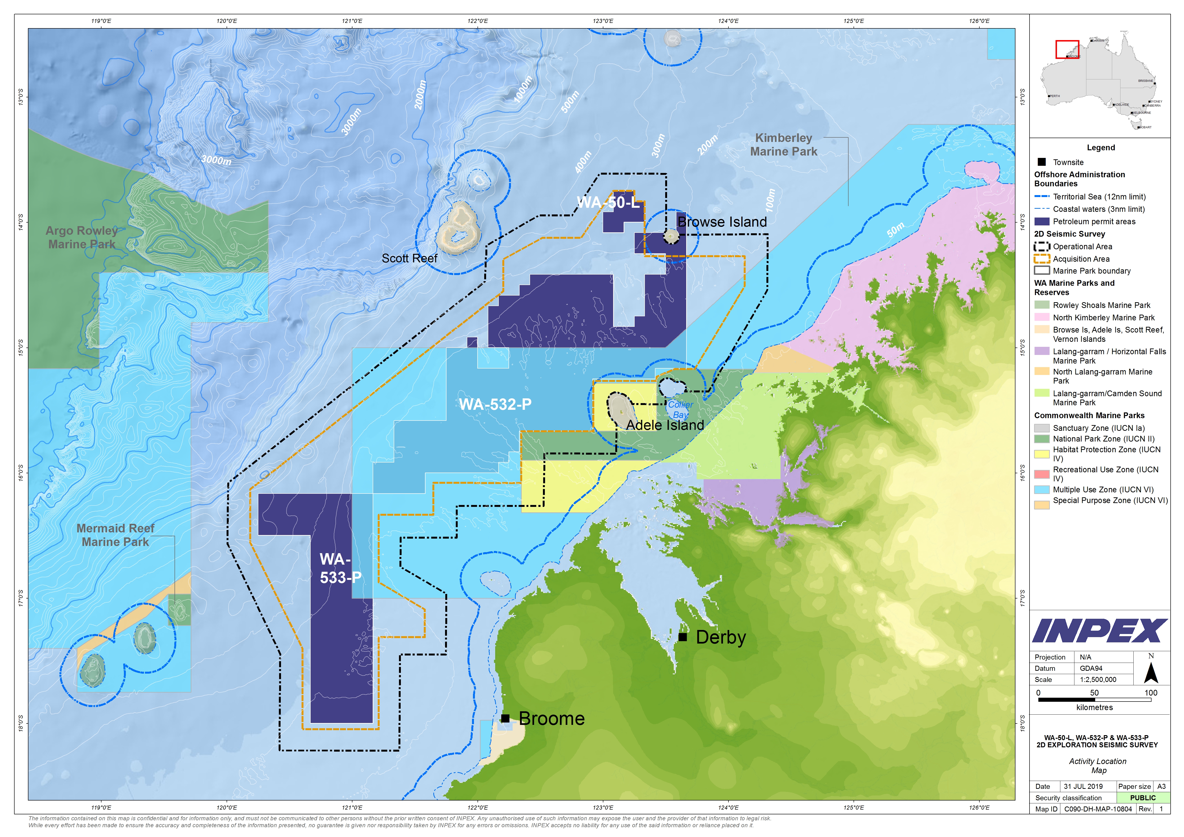 INPEX is proposing to undertake a two-dimensional (2D) seismic survey of Exploration Permits WA-532-P and WA-533-P in the Browse and Offshore Canning Basins. The 2D seismic survey will also include the acquisition of seismic data in Production Licence WA-50-L, also within the Browse Basin